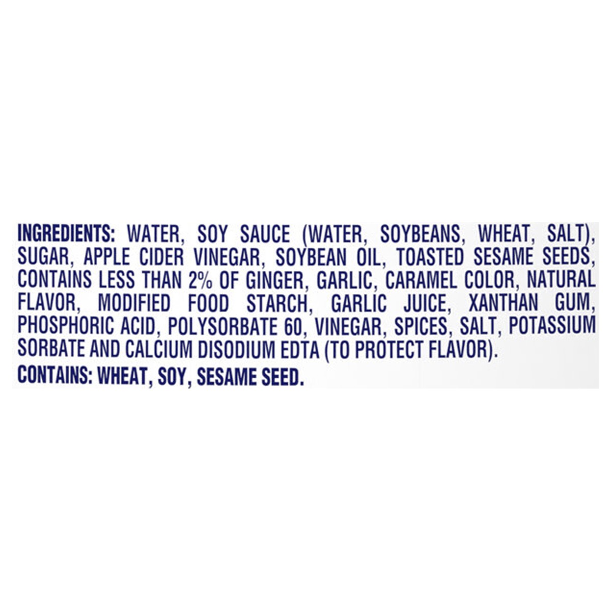 WATER, SOY SAUCE (WATER, SOYBEANS, WHEAT, SALT), SUGAR, APPLE CIDER VINEGAR, SOYBEAN OIL, TOASTED SESAME SEEDS, CONTAINS LESS THAN 2% OF GINGER, GARLIC, CARAMEL COLOR, NATURAL FLAVOR, MODIFIED FOOD ST…