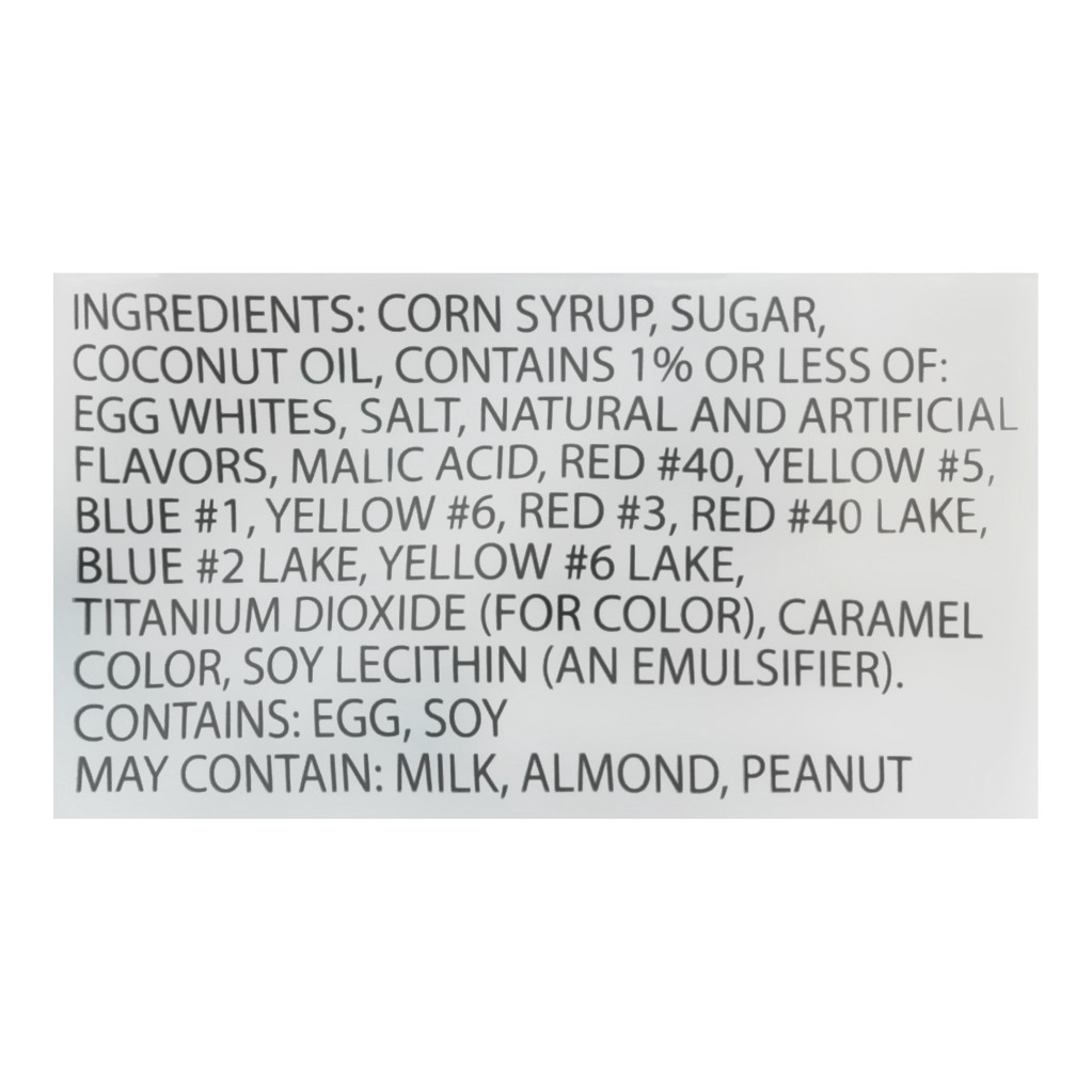 Corn Syrup, Sugar, Coconut Oil, Contains 1% or Less of: Egg Whites, Salt, Natural and Artificial Flavors, Malic Acid, Red 40, Yellow 5, Blue 1, Yellow 6, Red 3, Red 40 Lake, Blue 2 Lake, Yellow 6 Lakeā¦