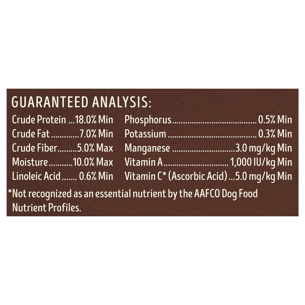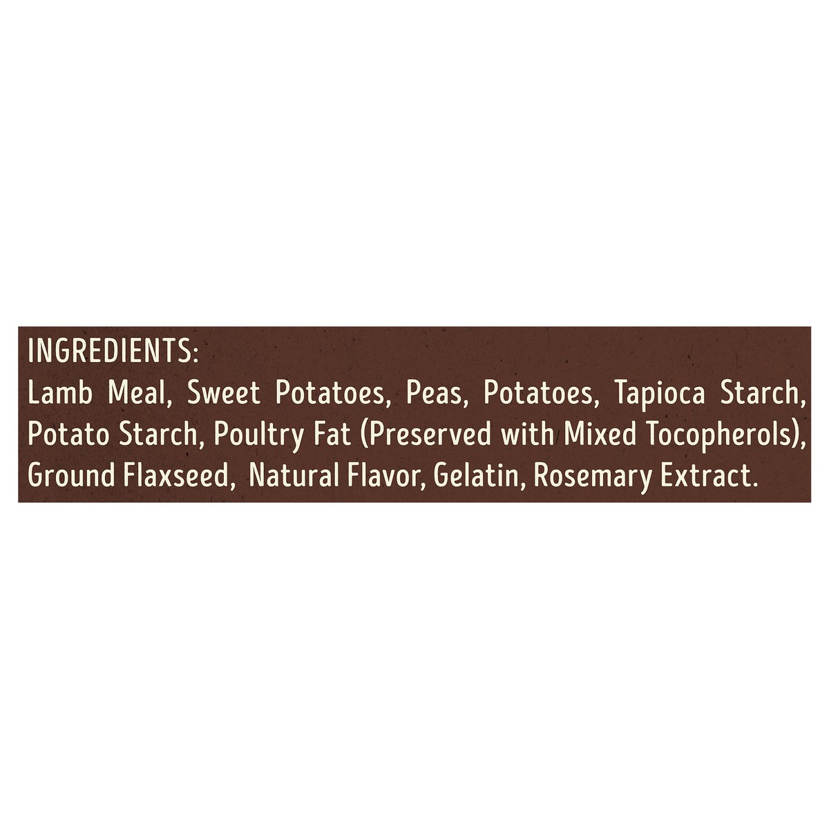 Lamb Meal, Sweet Potatoes, Peas, Potatoes, Tapioca Starch, Potato Starch, Poultry Fat (Preserved with Mixed Tocopherols), Ground Flaxseed, Natural Flavor, Gelatin, Rosemary Extract.