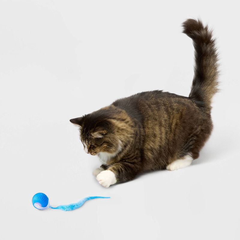 This Interactive Rolling Ball Cat Toy from Boots & Barkley™ provides a fun way to keep your tiny tiger entertained for hours. This blue ball rolls on its own and features a long, bushy tail that entic…