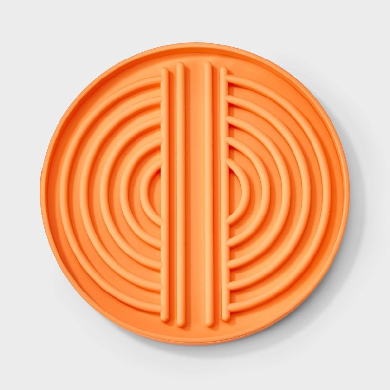 - Circular slow-feed pet mat in an orange hue