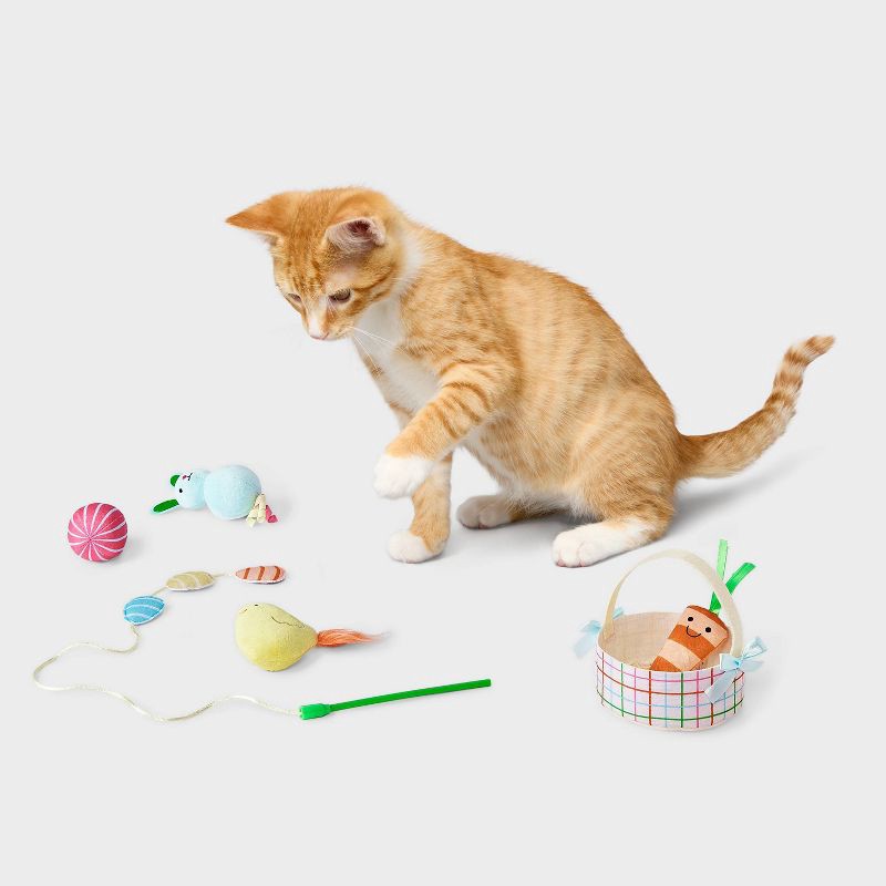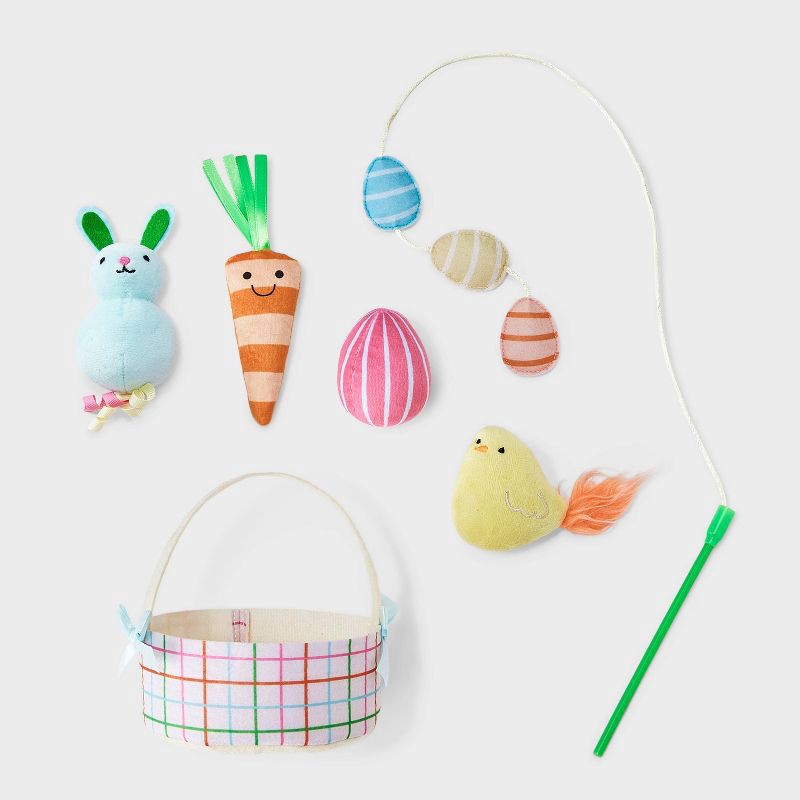 - Wand teaser and plush toys in Easter basket with pastel plaid pattern