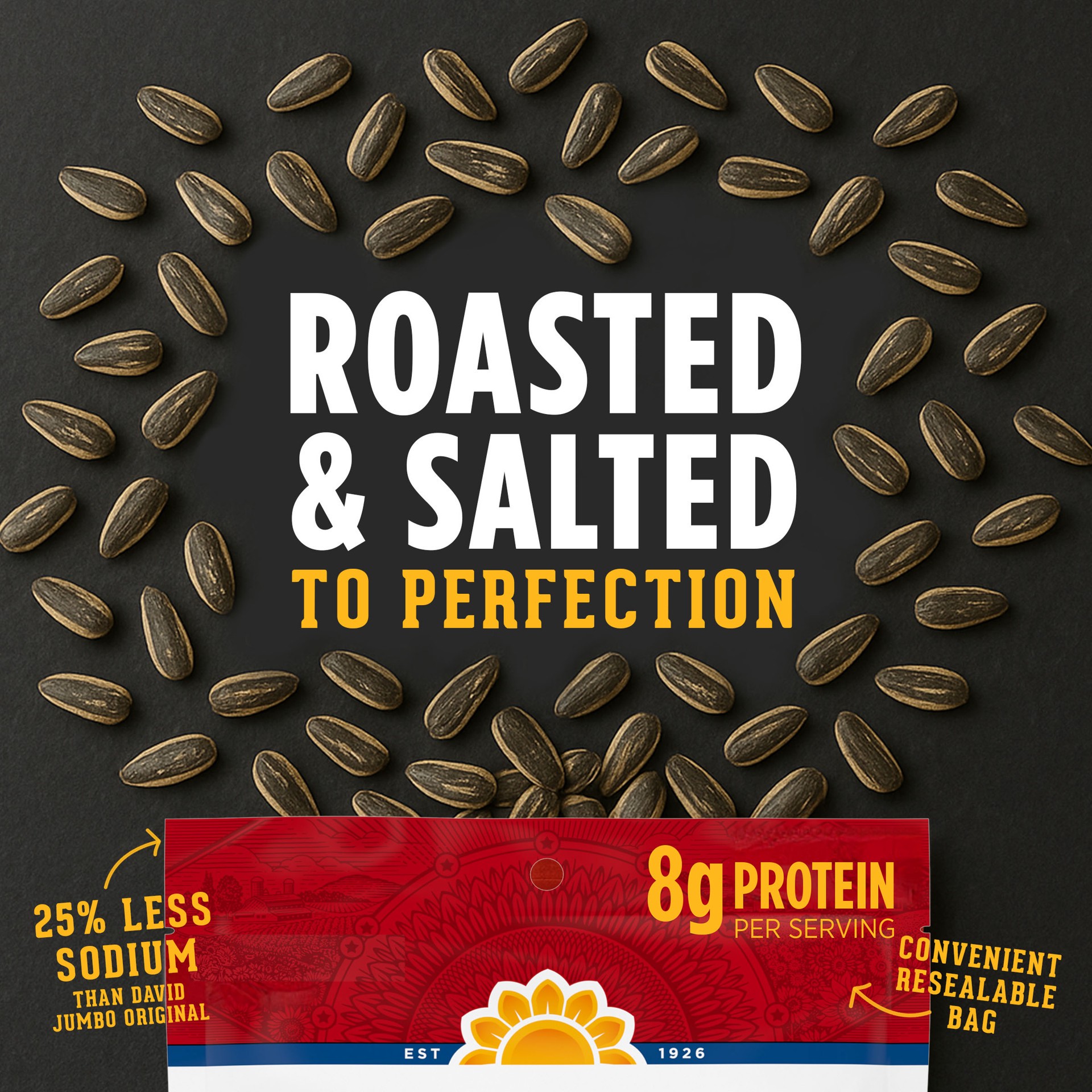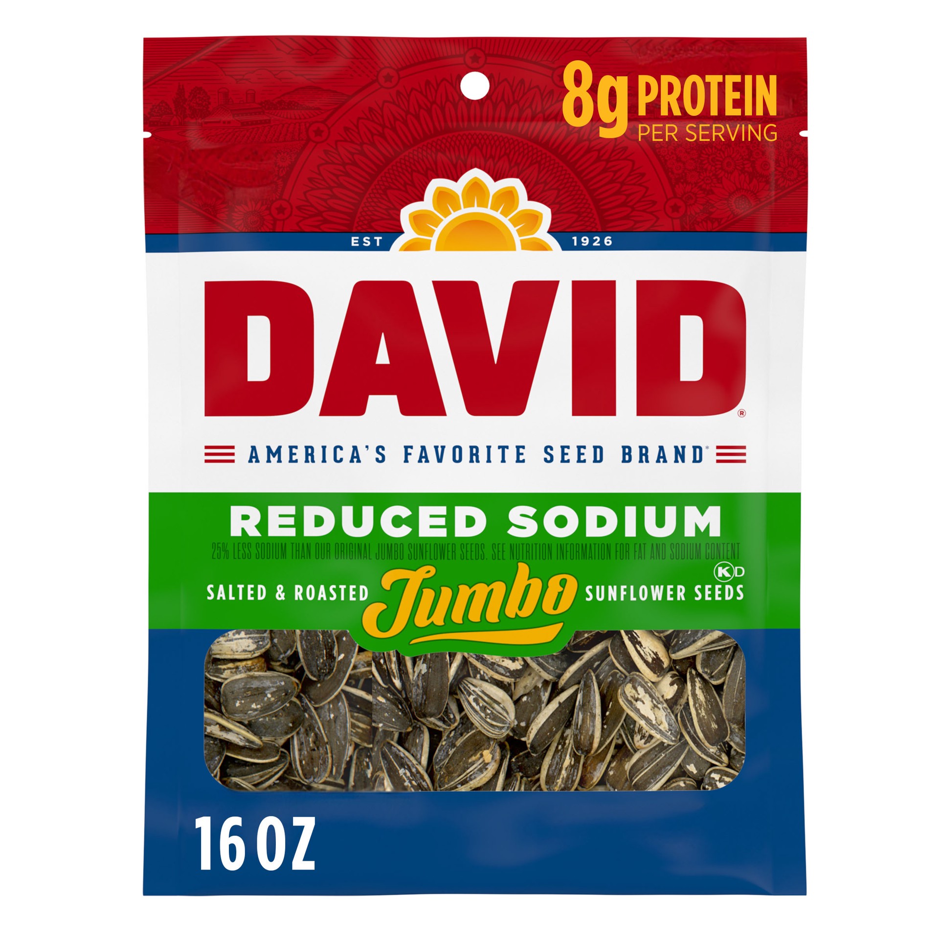 Enjoy the same great salted flavor you love with less sodium with DAVID Reduced Sodium Jumbo Sunflower Seeds. DAVID Reduced Sodium Seeds offer a satisfying snack on the go with the dependable great ta…