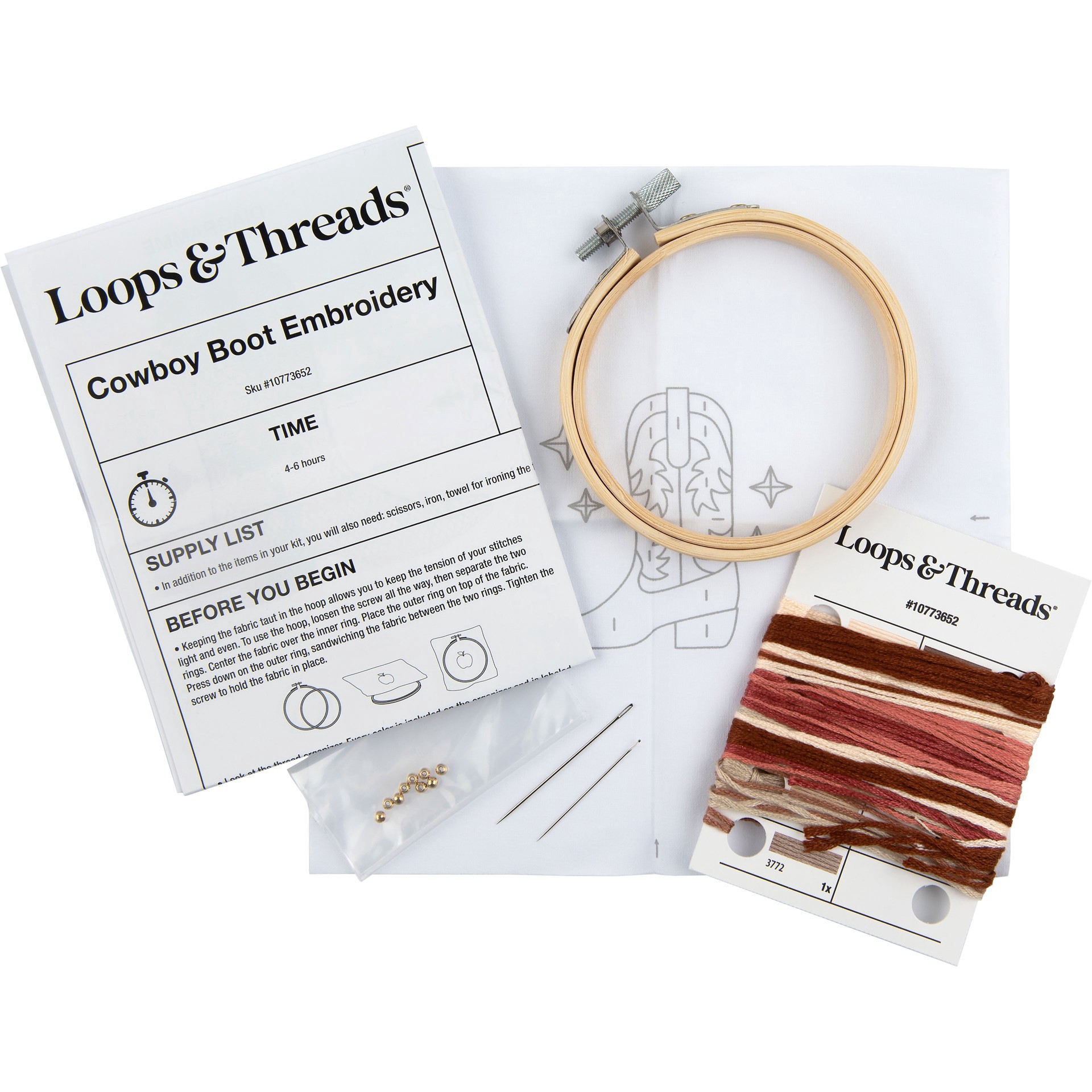 Buy the 3.5" Cowboy Boot Embroidery Kit by Loops & Threads at Michaels. Kick up your heels and unwind with this cowboy boot embroidery design. Featuring gold tone beads, it's a great way to add a touc…
