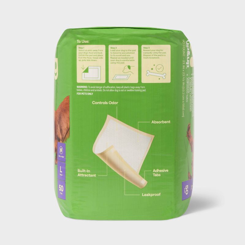 Make your pet's potty training simple and mess free with these 50-Count Bamboo Dog Training Pads from up&up™. Made of bamboo, these unscented disposable training pads come with a built-in attractant t…