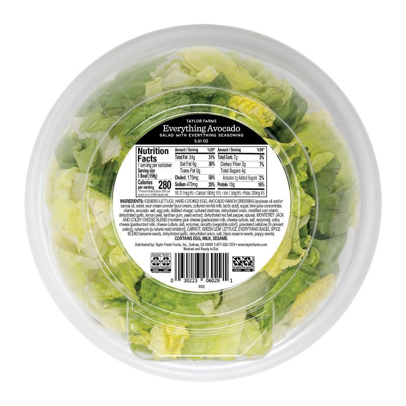 - Features iceberg and green leaf lettuce, shredded carrots, egg, Jack-Colby cheese, and everything seasoning