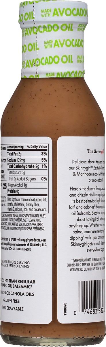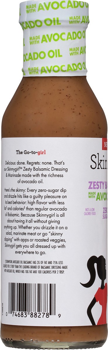 Dip, drizzle and pour to your heart's delight with Skinnygirl Zesty Balsamic Dressing and Marinade. This zero sugar sauce and dressing is made with the goodness of avocado oil for a zesty balsamic dre…