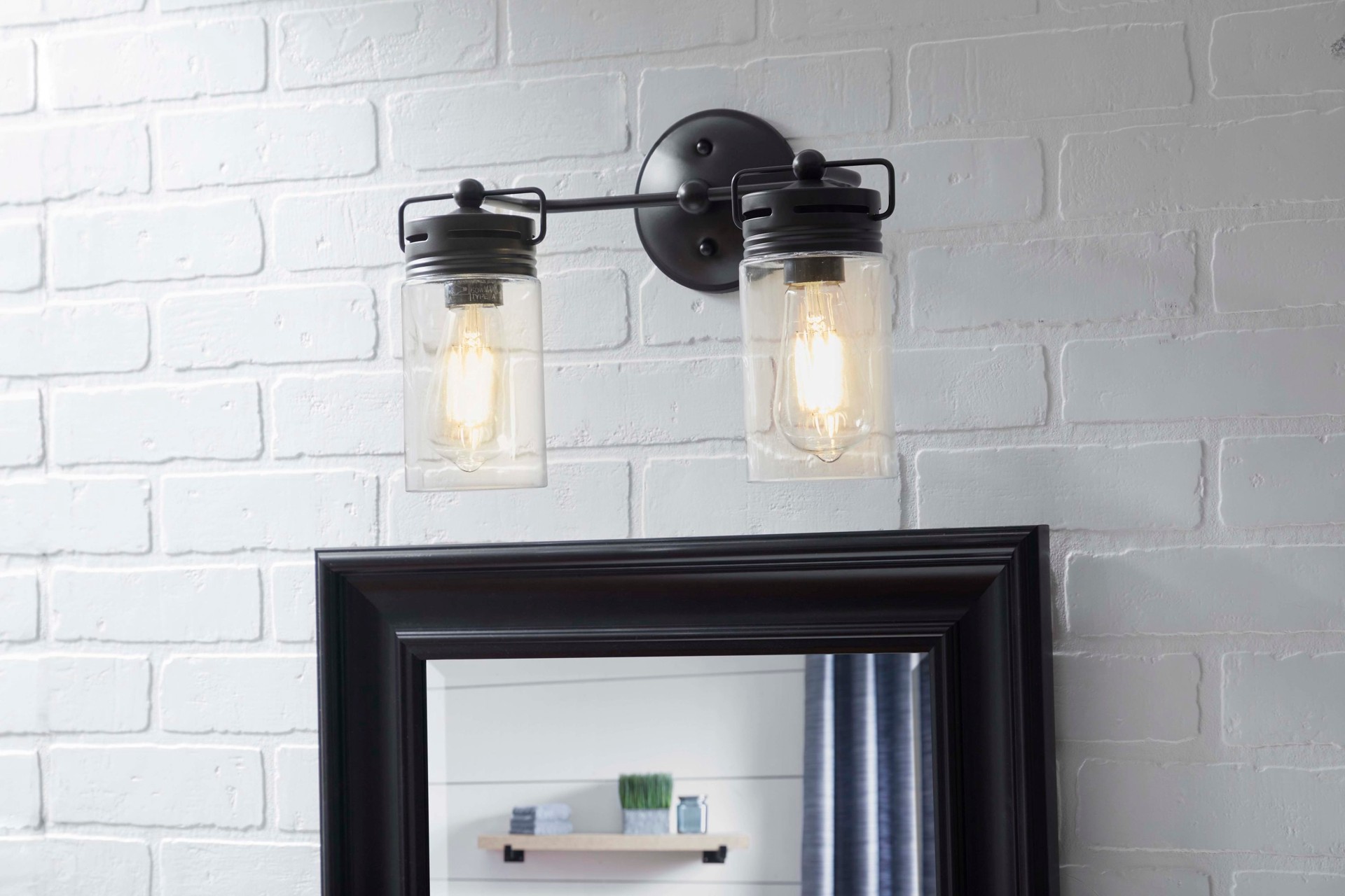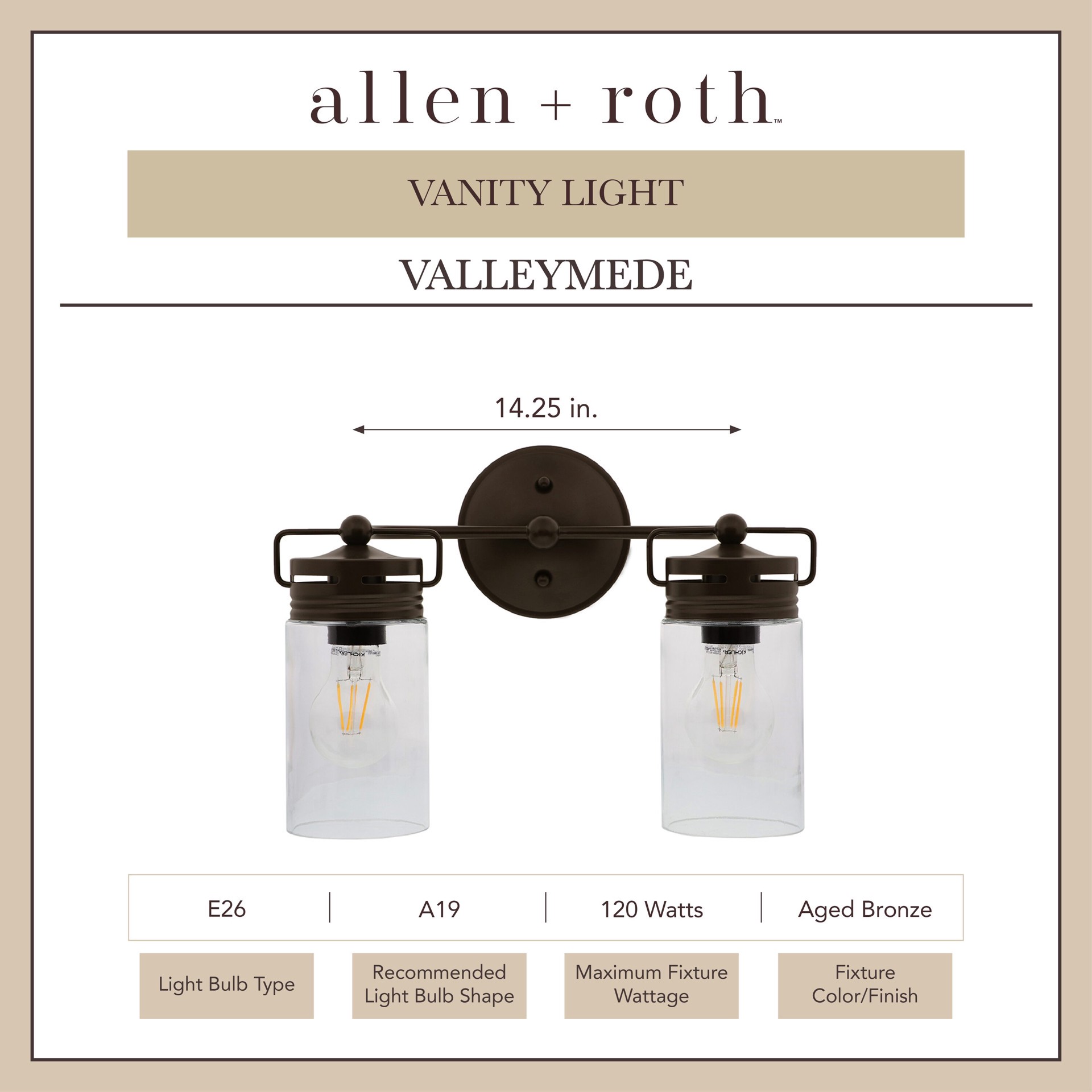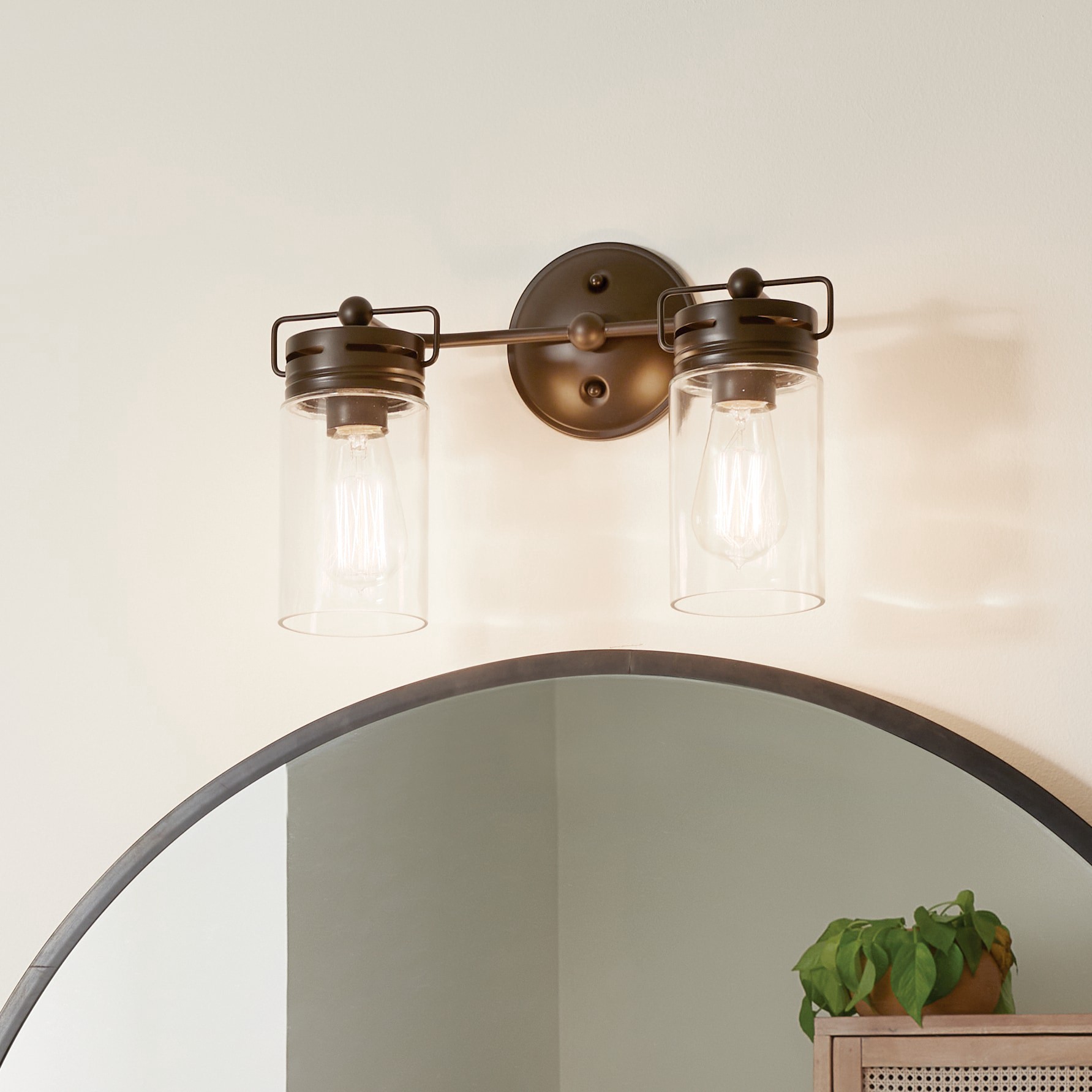 Aged bronze finish bathroom vanity light from the Vallymede collection. Eclectic jar-style clear glass shades are a simple, attractive way to update your decor. Requires two 60-watt medium base bulbs …