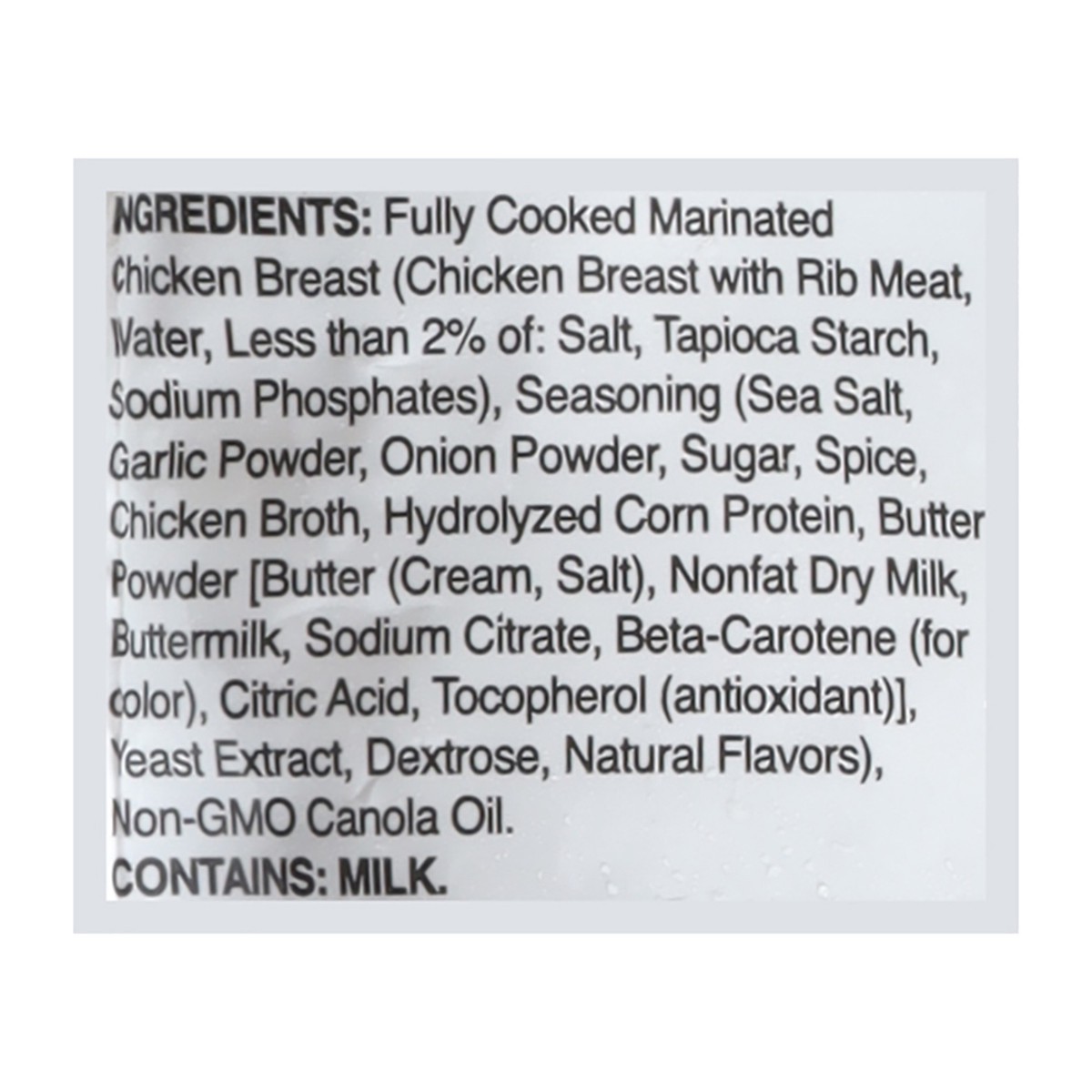 Fully Cooked Marinated Chicken Breast (Chicken Breast with Rib Meat, Water, Less than 2% of: Salt, Tapioca Starch, Sodium Phosphates), Seasoning (Sea Salt, Garlic Powder, Onion Powder, Sugar, Spice, C…