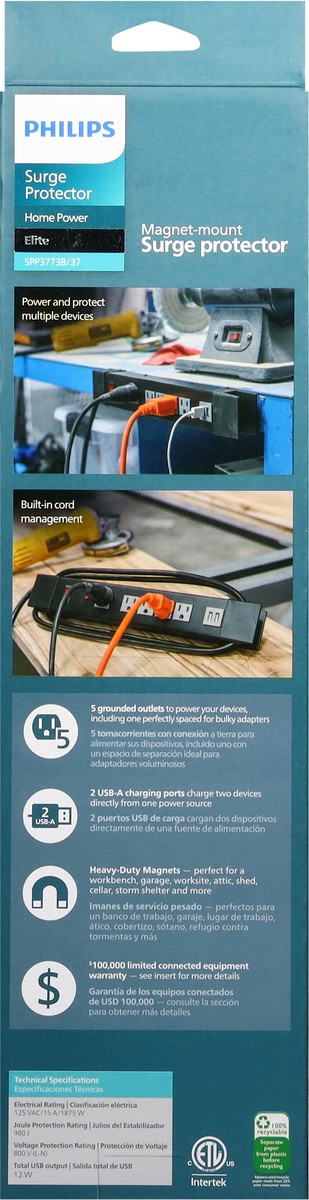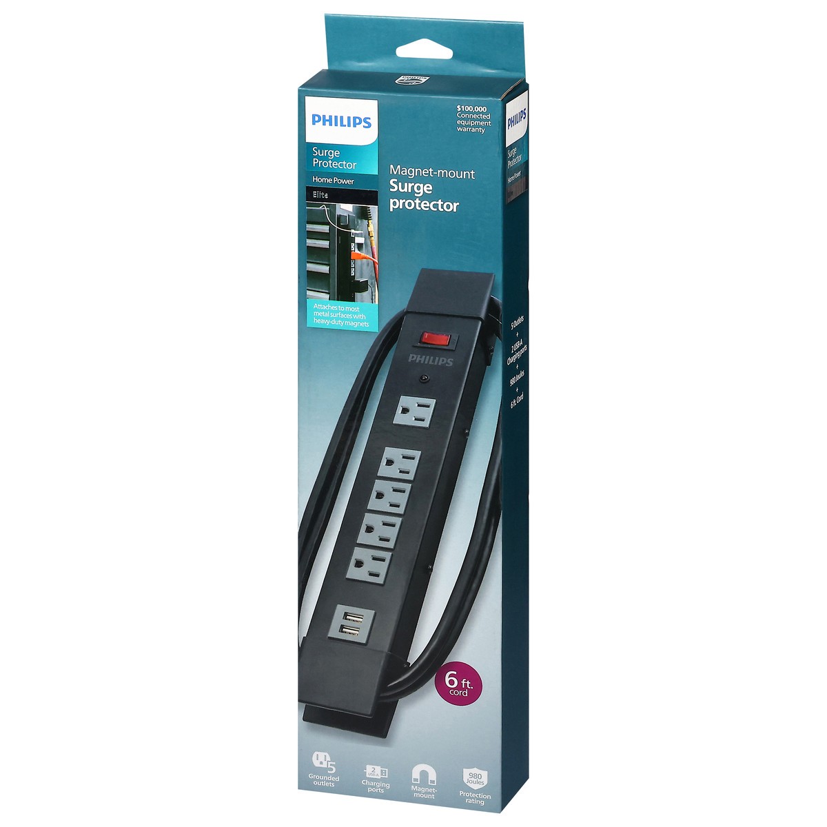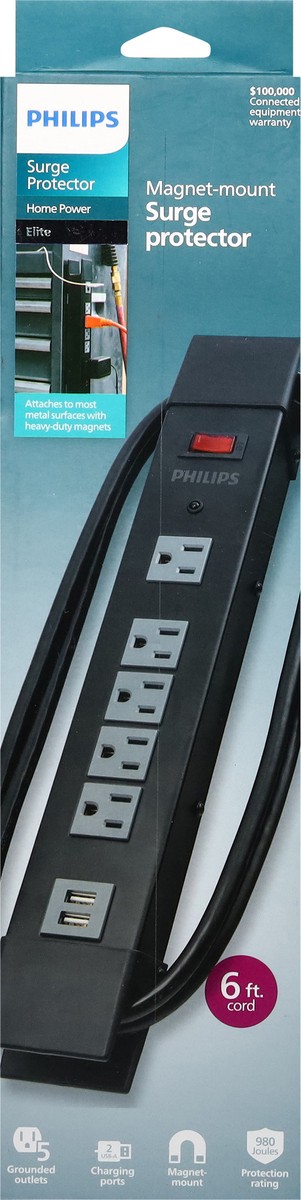 Magnet-mounted attaches to most metal surfaces 5 grounded outlets, including one for oversized adapters 2 USB-A ports 6-foot cord 980 Joule rating
