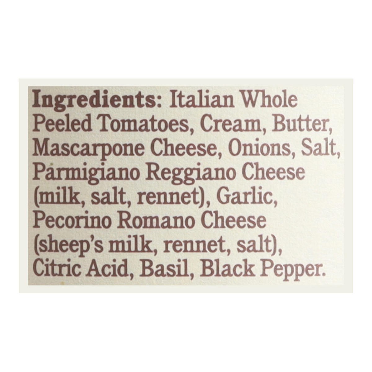 Italian Whole Peeled Tomatoes, Cream, Butter, Mascarpone Cheese, Onions, Salt, Parmigiano Reggiano Cheese (Milk, Salt, Rennet), Garlic, Pecorino Romano Cheese (Sheep’s Milk, Rennet, Salt), Citric Acid…