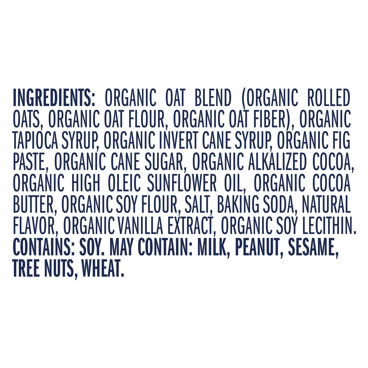 INGREDIENTS: ORGANIC OAT BLEND (ORGANIC ROLLED OATS, ORGANIC OAT FLOUR, ORGANIC OAT FIBER), ORGANIC TAPIOCA SYRUP, ORGANIC INVERT CANE SYRUP, ORGANIC FIG PASTE, ORGANIC CANE SUGAR, ORGANIC ALKALIZED C…
