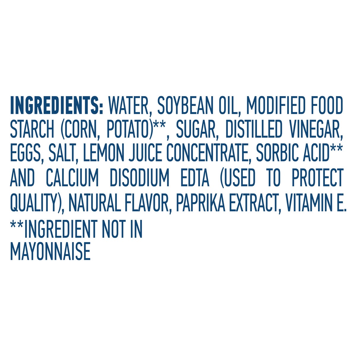 Water\, Soybean Oil\, Modified Food Starch (Corn\, Potato) (Ingredient Not Found in Regular Mayonnaise)\, Sugar\, Distilled Vinegar\, Salt\, Whole Eggs\, Egg Yolks\, Lemon Juice Concentrate\, Sorbic A…