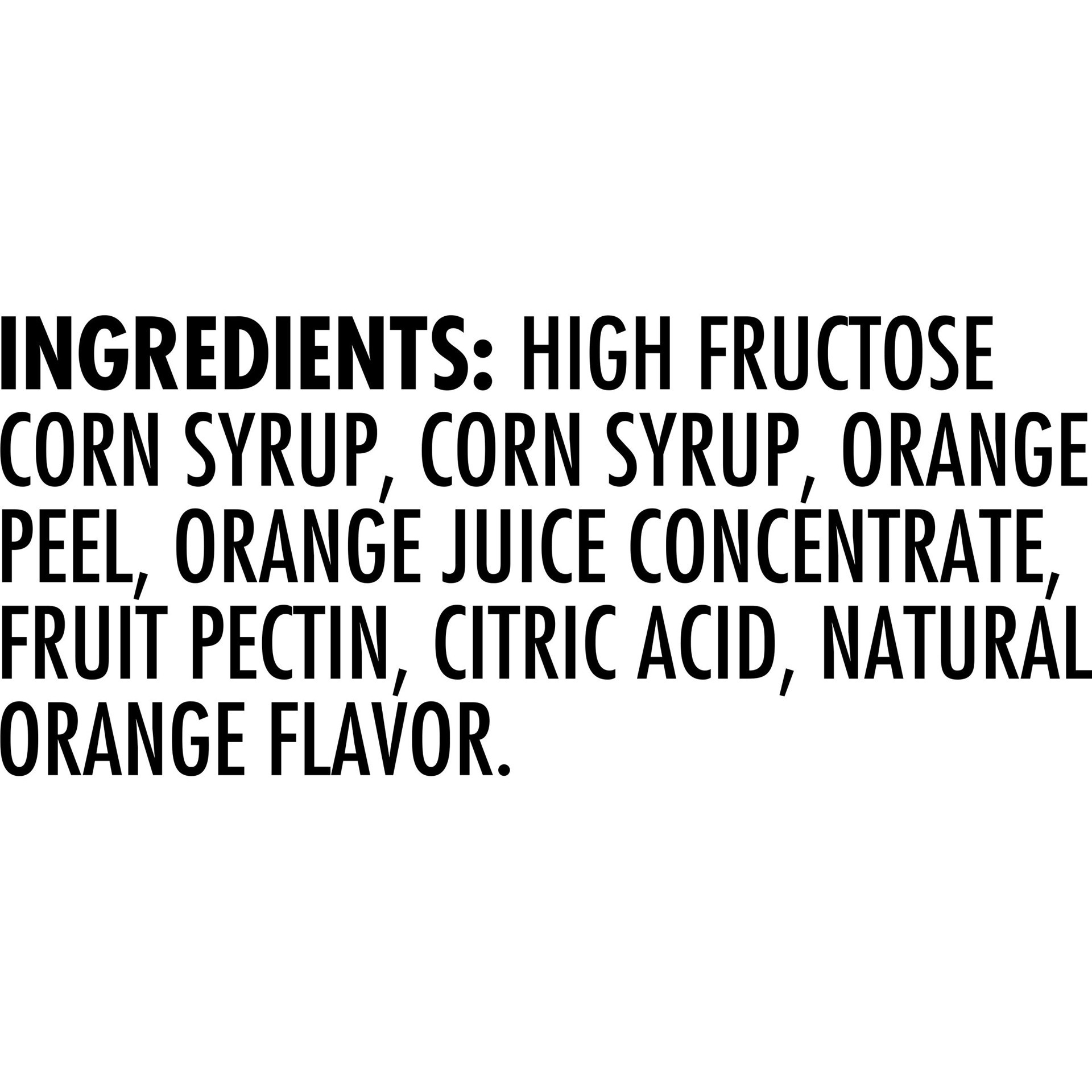 High Fructose Corn Syrup, Corn Syrup, Orange Peel, Orange Juice Concentrate, Fruit Pectin, Citric Acid, Natural Orange Flavor.