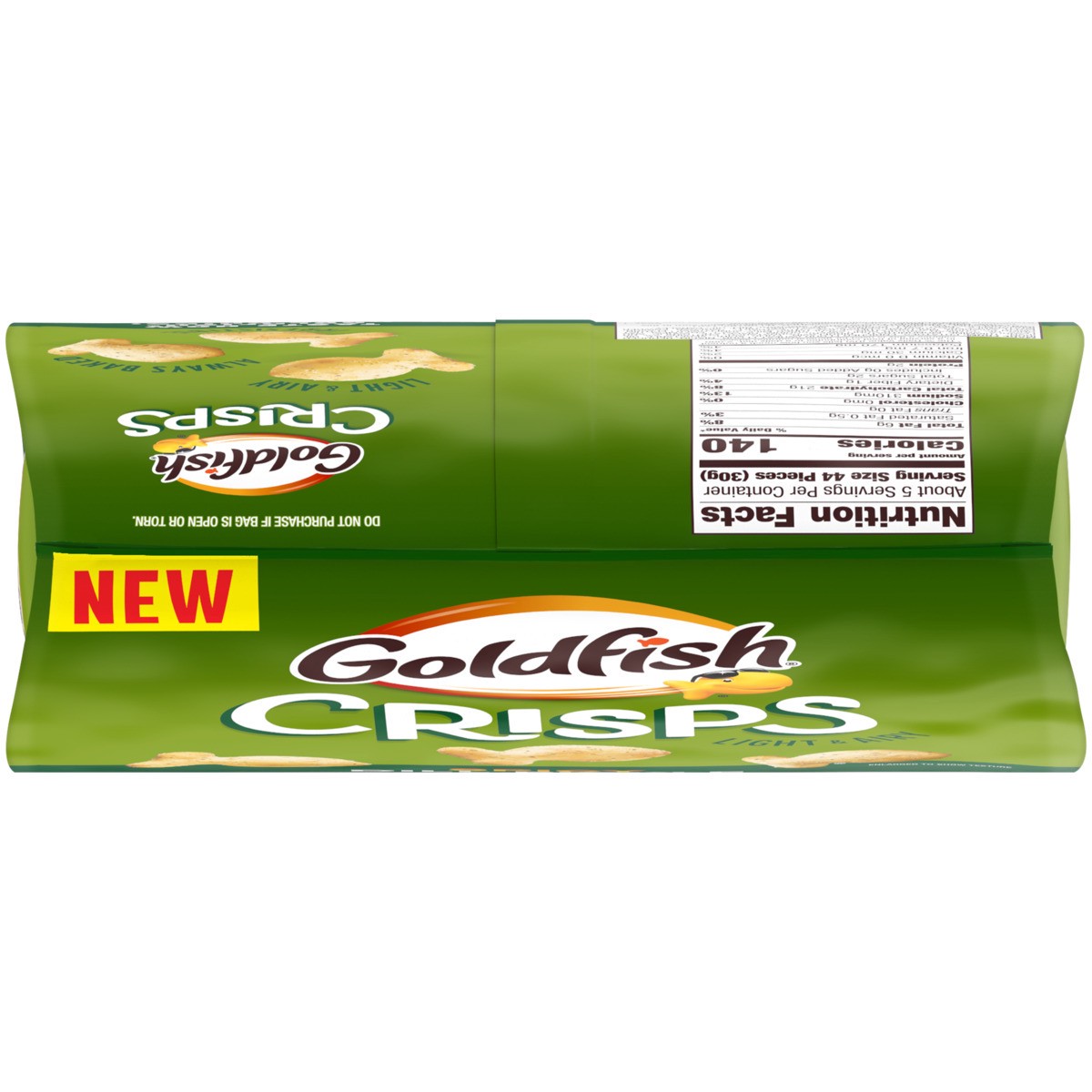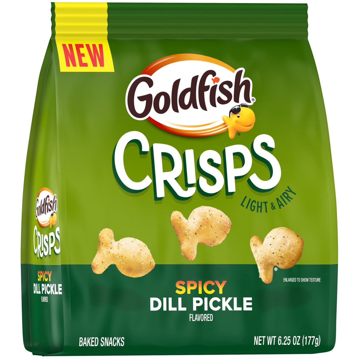 Dill-ight in Goldfish Spicy Dill Pickle Flavored Crisps! These irresistible Goldfish have a light and airy crunch and are made with potato and wheat, for a perfect chip-like snack in the bite-sized, i…
