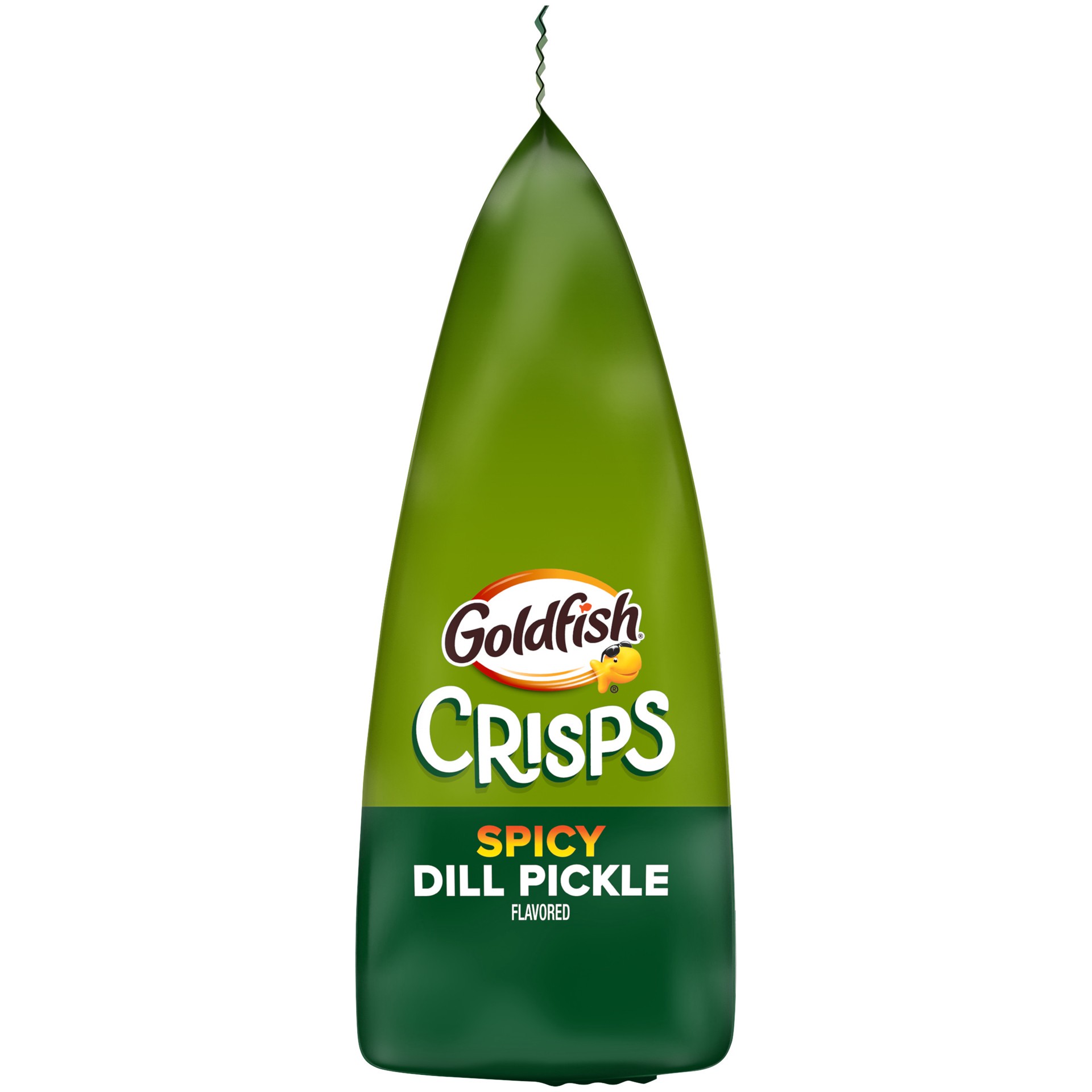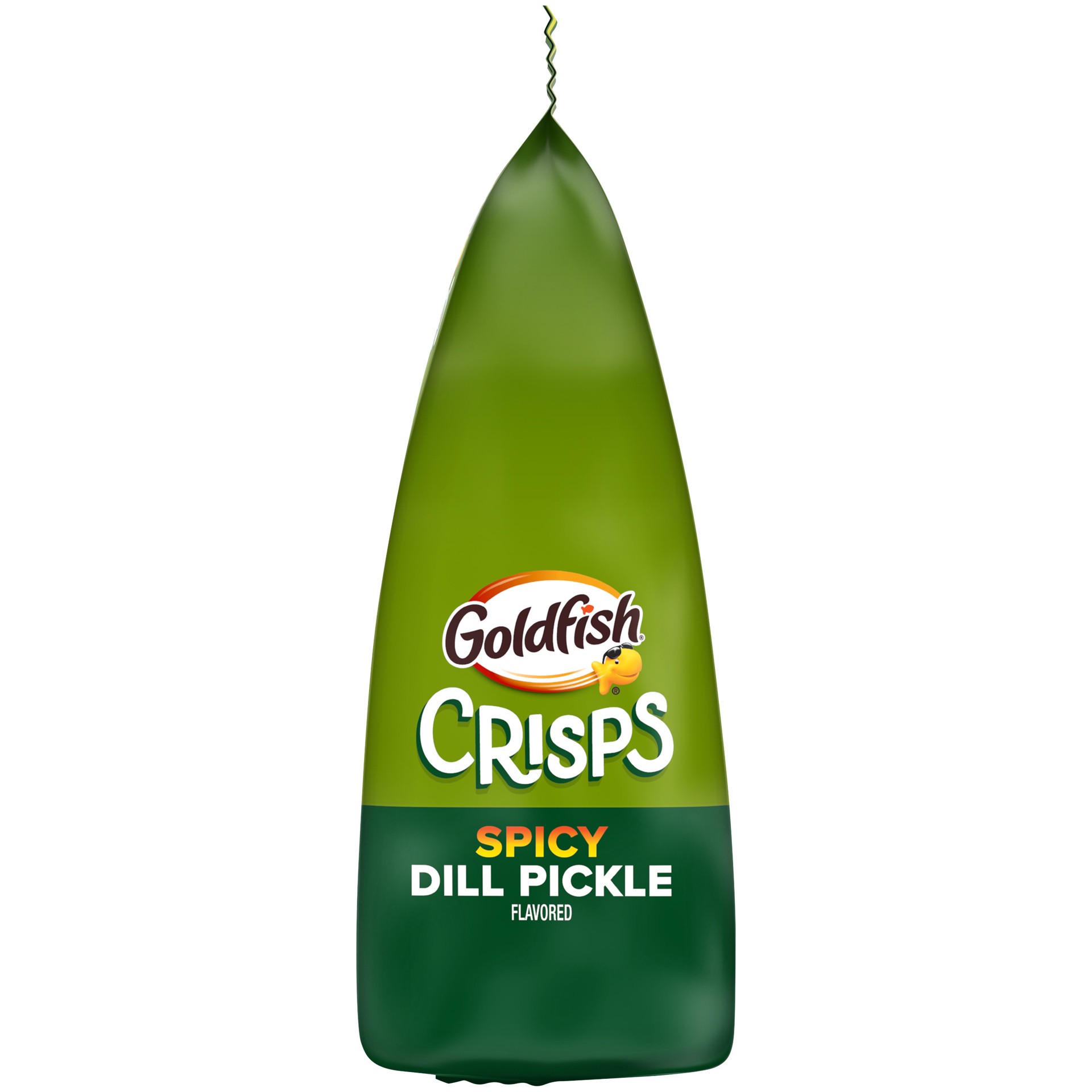Dill-ight in Goldfish Spicy Dill Pickle Flavored Crisps! These irresistible Goldfish have a light and airy crunch and are made with potato and wheat, for a perfect chip-like snack in the bite-sized, i…