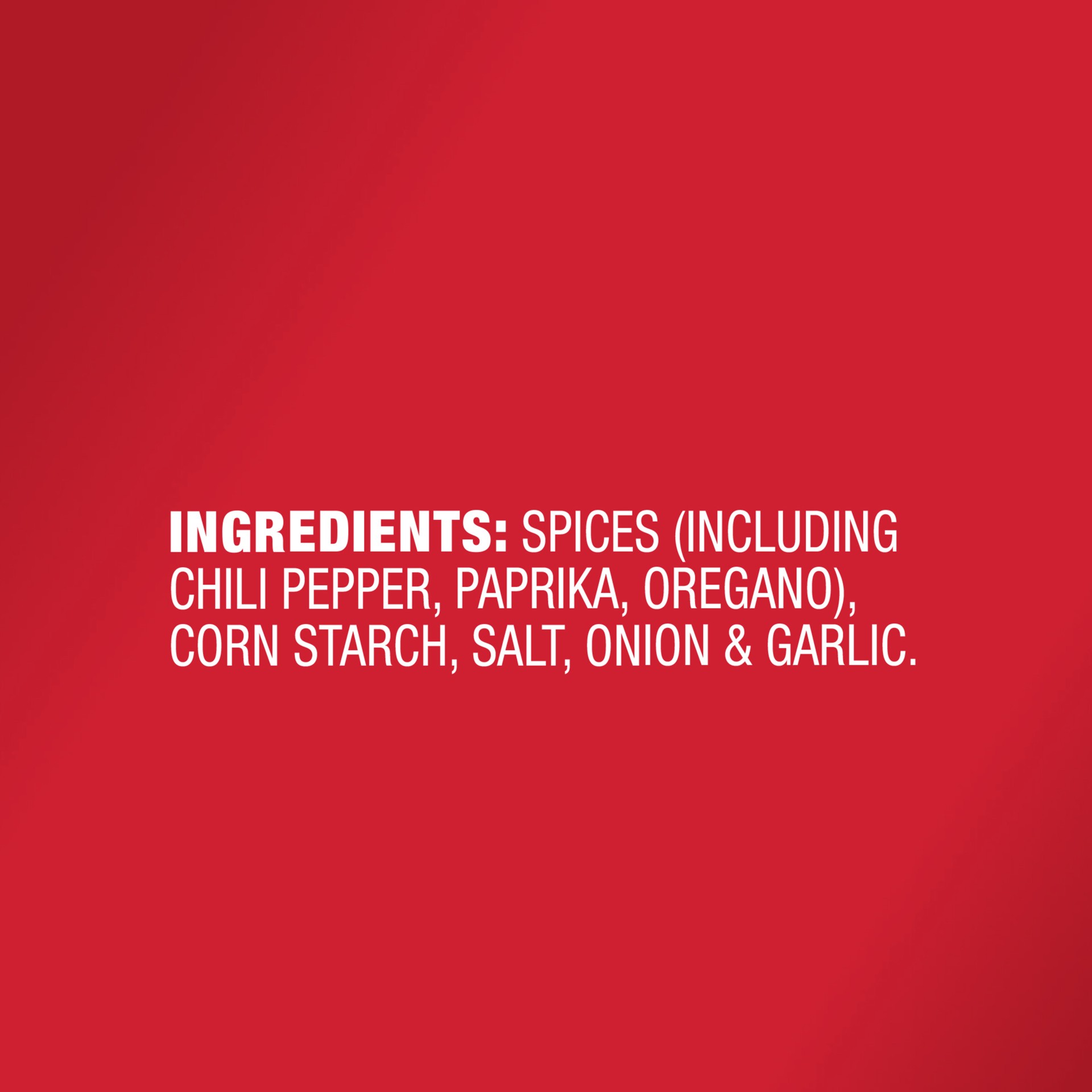 Spices (Including Chili Pepper, Paprika, Oregano), Corn Starch, Onion, Salt and Garlic.