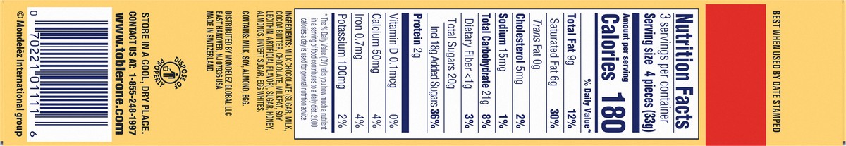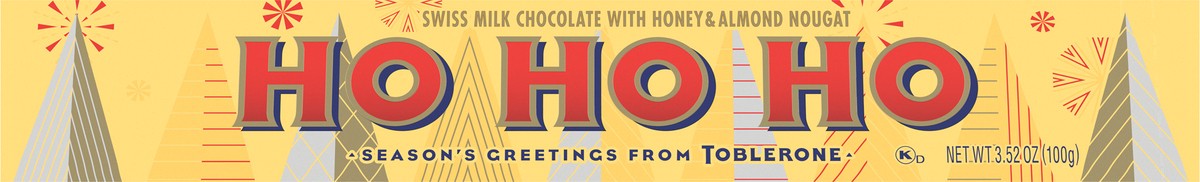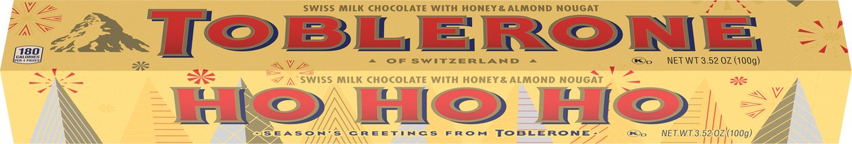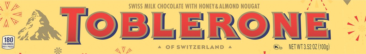 - One 3.52 oz Toblerone Swiss Milk Chocolate Candy Bar with Honey and Almond Nougat