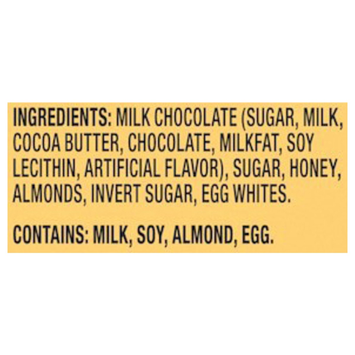 Milk Chocolate (Sugar, Milk, Cocoa Butter, Chocolate, Milkfat, Soy Lecithin, Artificial Flavor), Sugar, Honey, Almonds, Invert Sugar, Egg Whites.