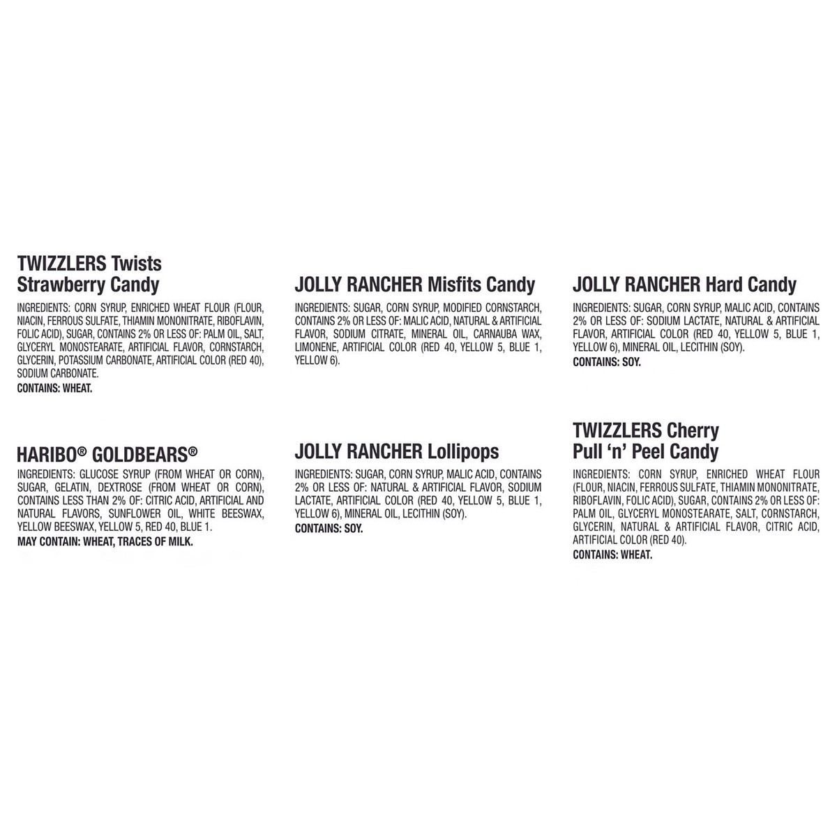 Twizzlers twists strawberry candy : contains: wheat.,haribo goldbears : may contains: wheat, traces of milk.,jolly rancher lollipops : contains: soy.,jolly rancher hard candy : contains: soy.,twizzlers cherry pull 'n' peel candy: contains: wheat.