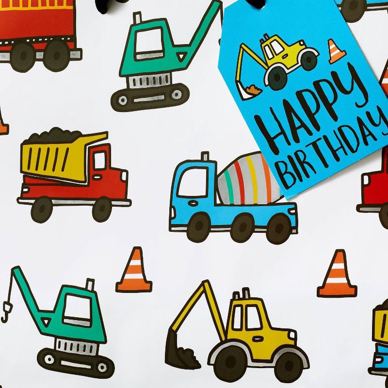 You'll love gifting birthday presents with this Construction Gift Bag from Spritz. This birthday gift bag features a printed graphic of various types of vehicles — ranging from dump trucks and fire tr…