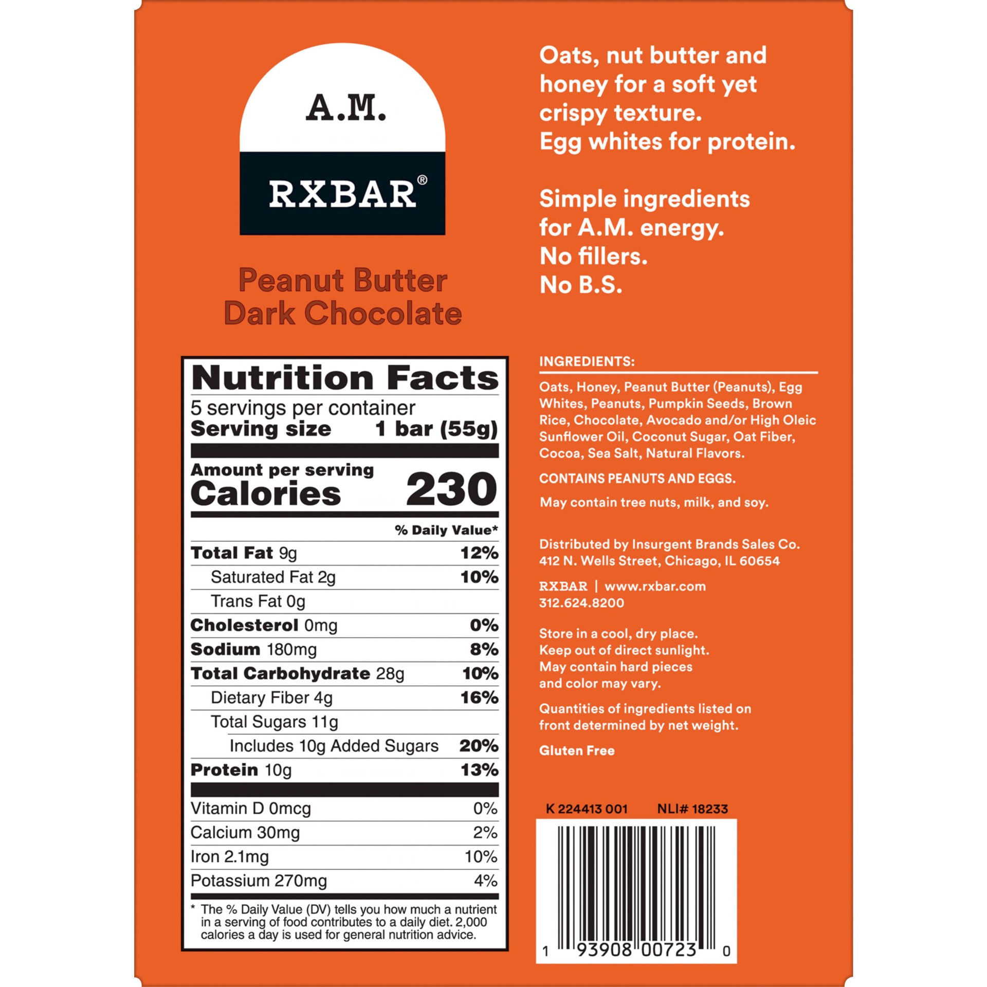 - 9.7oz box containing 5 RXBAR Nut Butter and Oat Dark Chocolate Peanut Butter protein bars