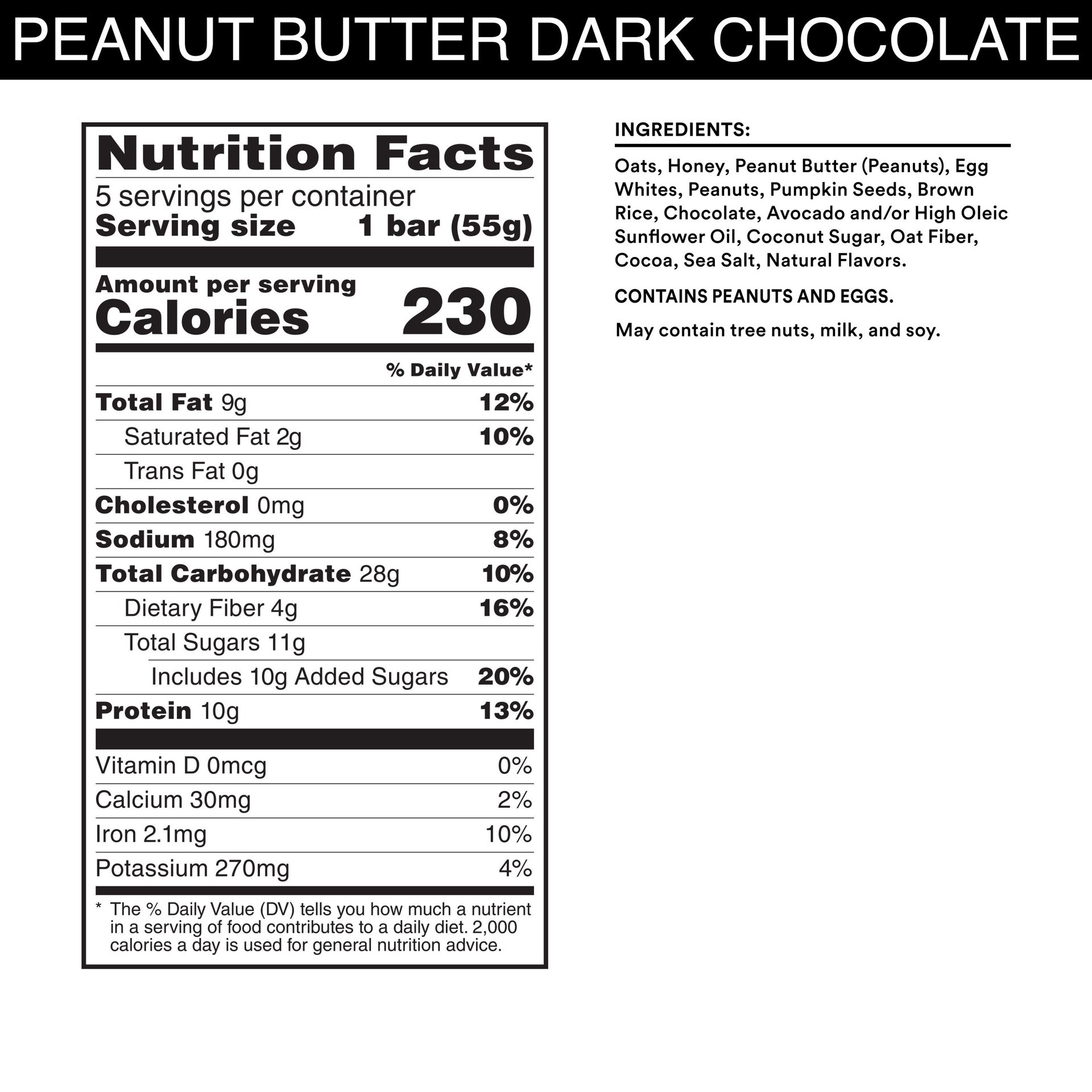 Oats, Honey, Peanut Butter (Peanuts), Egg Whites, Peanuts, Pumpkin Seeds, Brown Rice, Chocolate, Avocado and/or High Oleic Sunflower Oil, Coconut Sugar, Oat Fiber, Cocoa, Sea Salt, Natural Flavors.