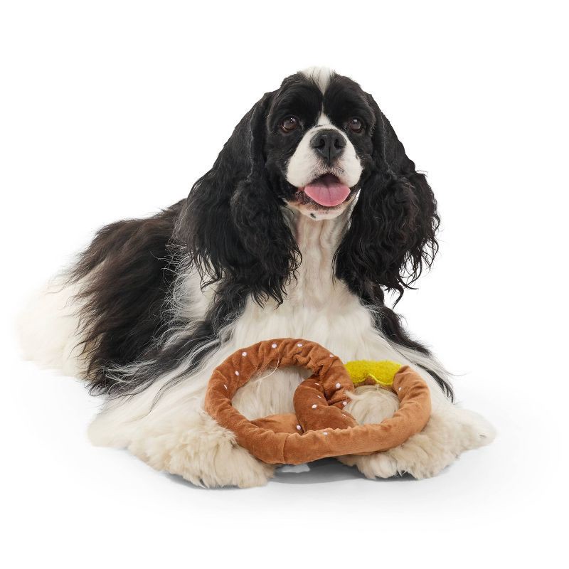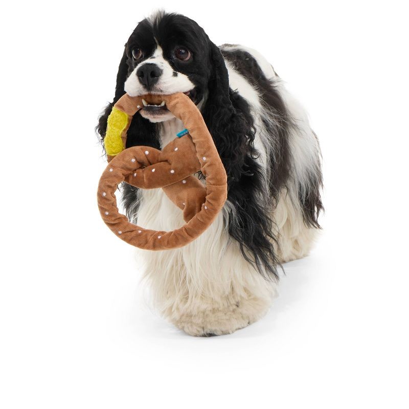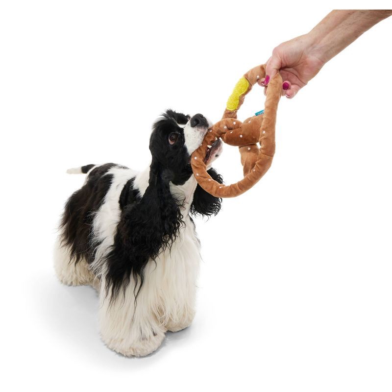 BARK's Salty Dog Pretzel plush dog toy is all that and a bag of chips—well, pretzels! This toy features a T-shirt rope, perfect for pups who love tug-of-war. And with no messy fluff, it ensures platim…