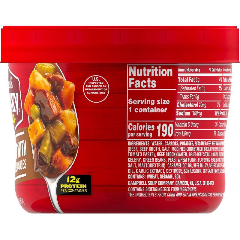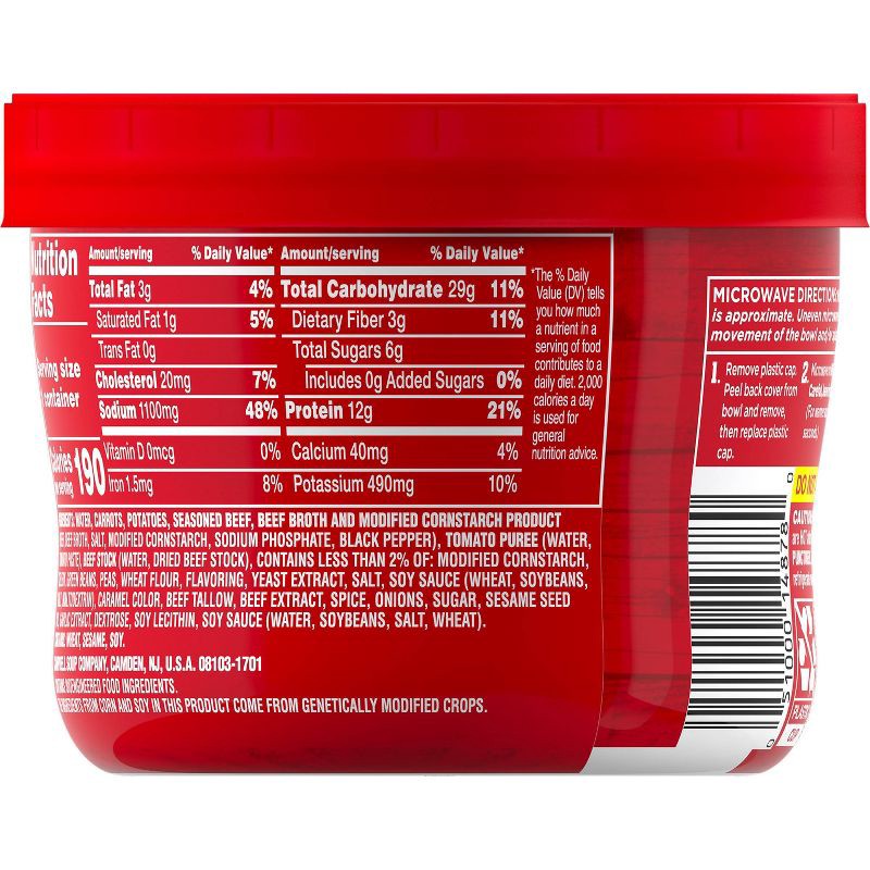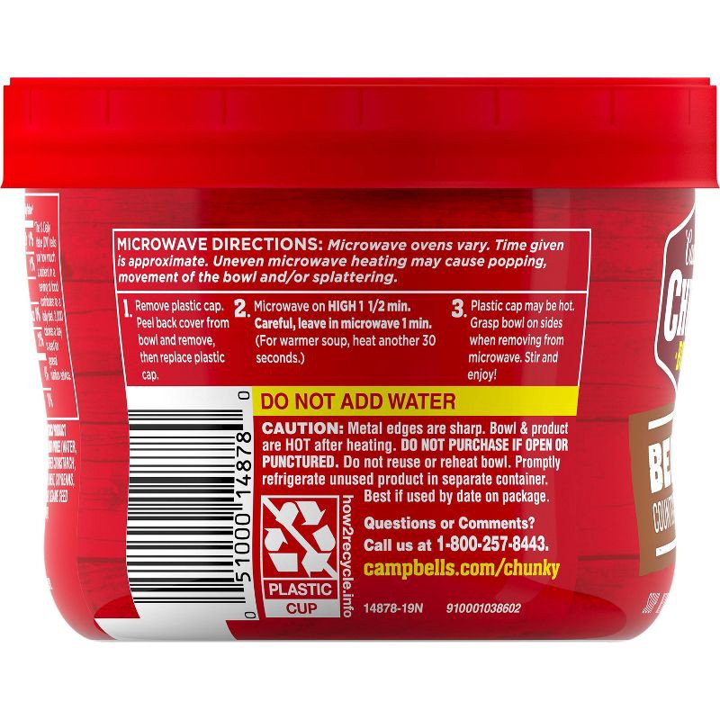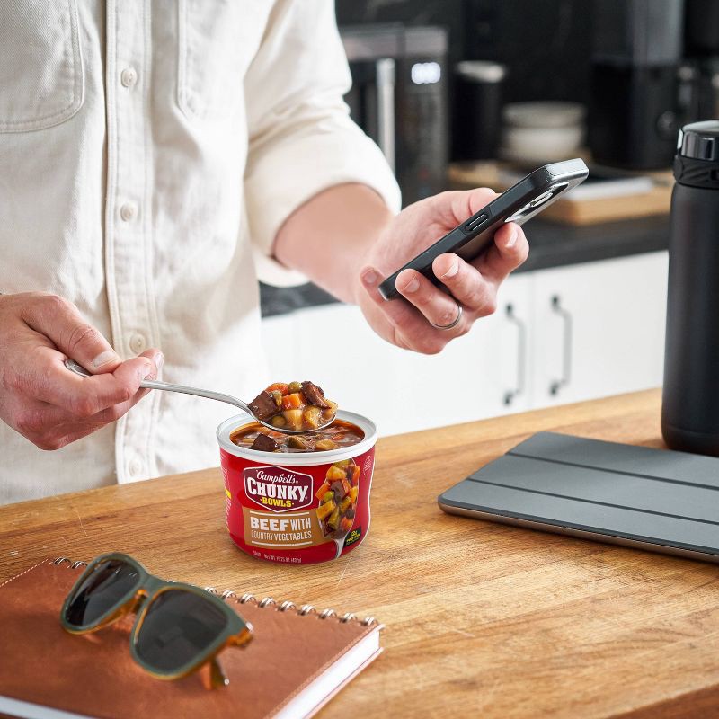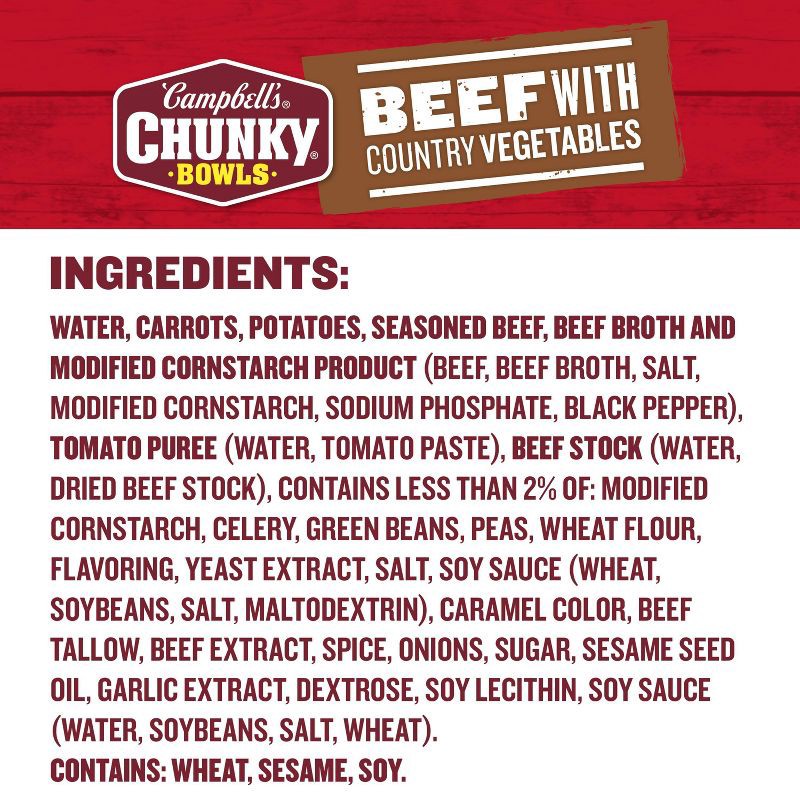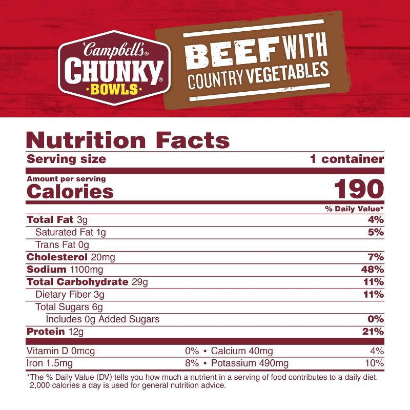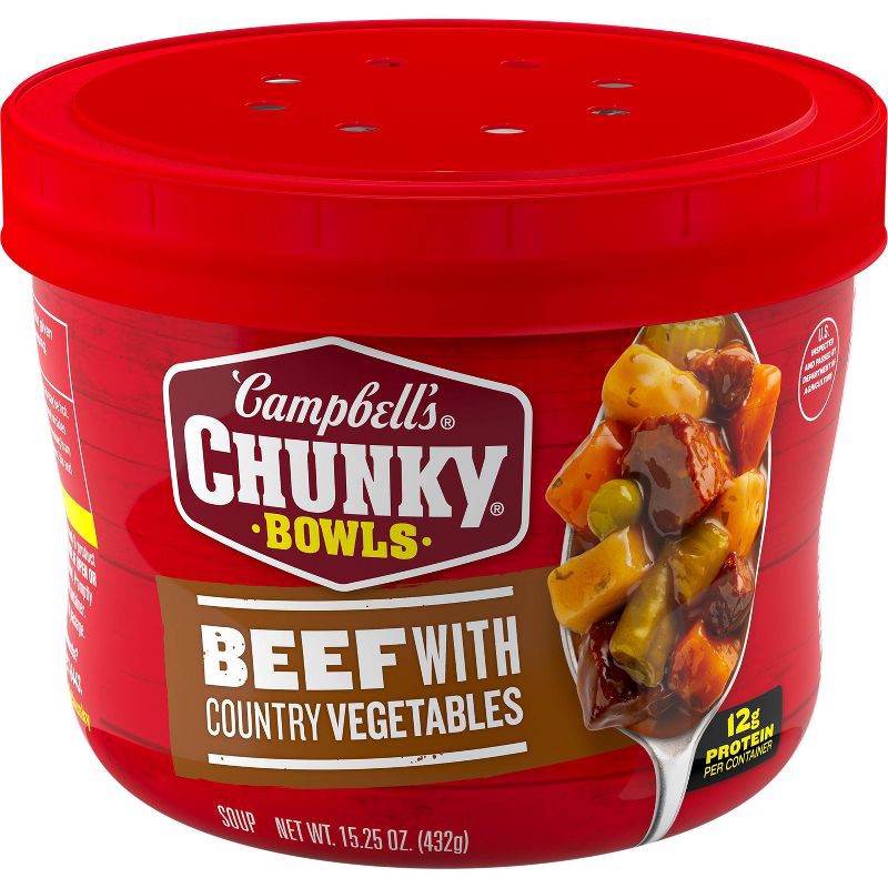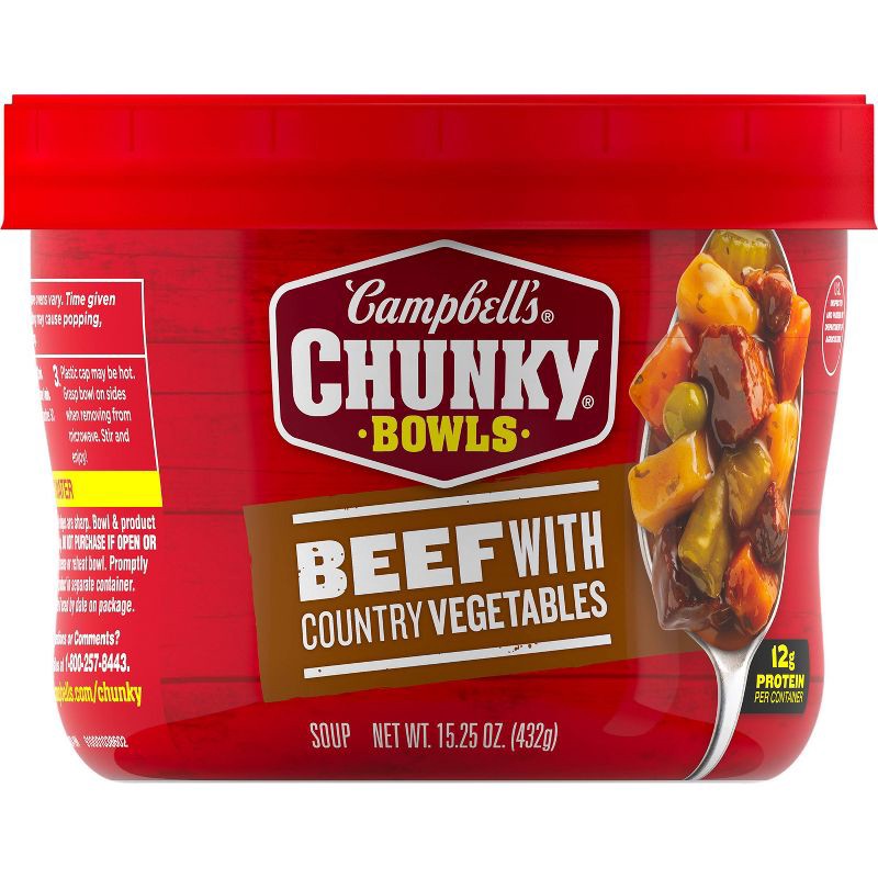 - Campbell's® Chunky® Soup: One (1) 15.25 oz microwavable bowl of Campbell's® Chunky® Beef Soup with Country Vegetables