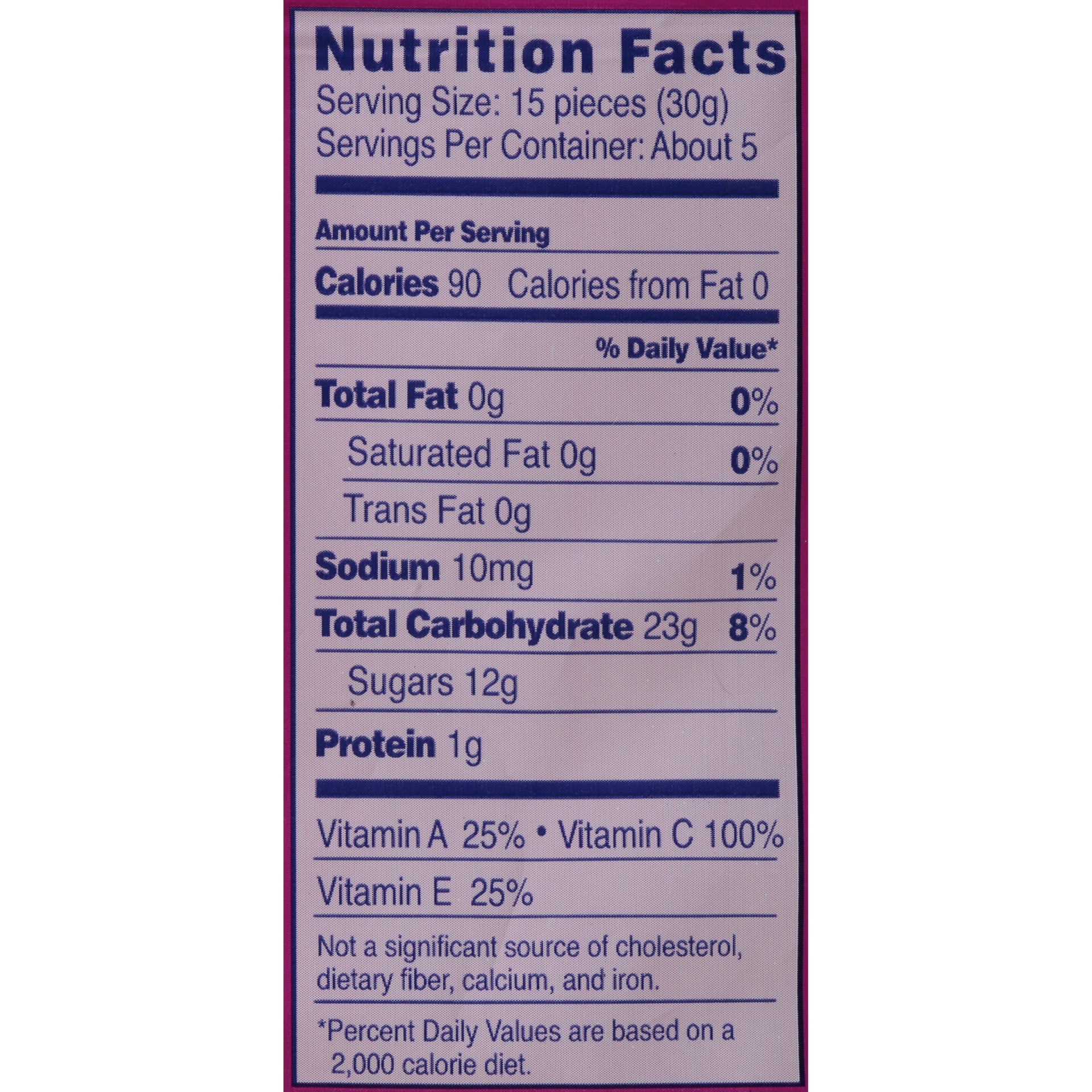 Whole Fruit Puree (Grape, Peach, Strawberry, Raspberry, Blackberry, Blueberry and Cherry), Corn Syrup, Sugar, Modified Corn Starch, Gelatin, Citric Acid (Acidulant), Lactic Acid, Natural and Artificia…