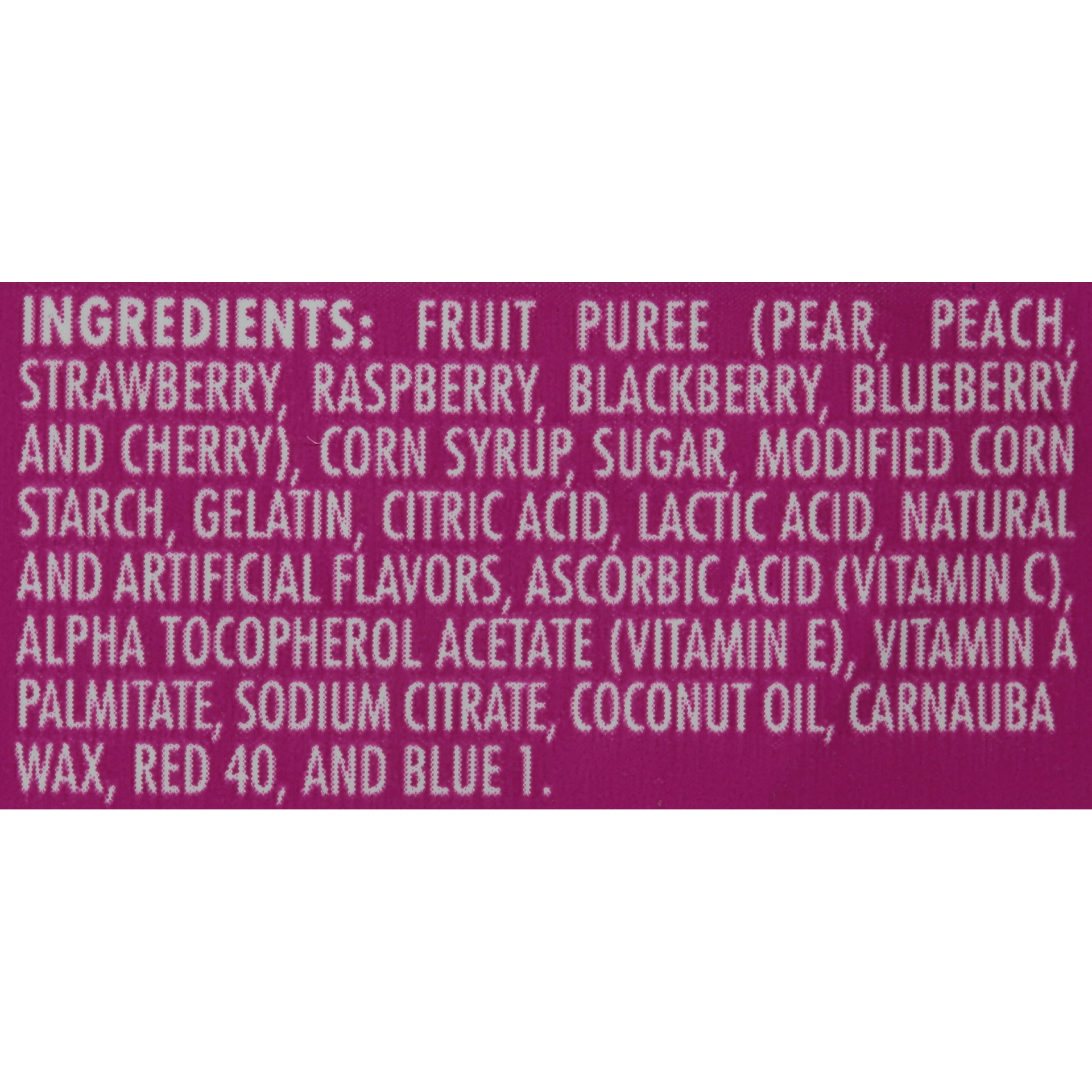 Whole Fruit Puree (Grape, Peach, Strawberry, Raspberry, Blackberry, Blueberry and Cherry), Corn Syrup, Sugar, Modified Corn Starch, Gelatin, Citric Acid (Acidulant), Lactic Acid, Natural and Artificia…