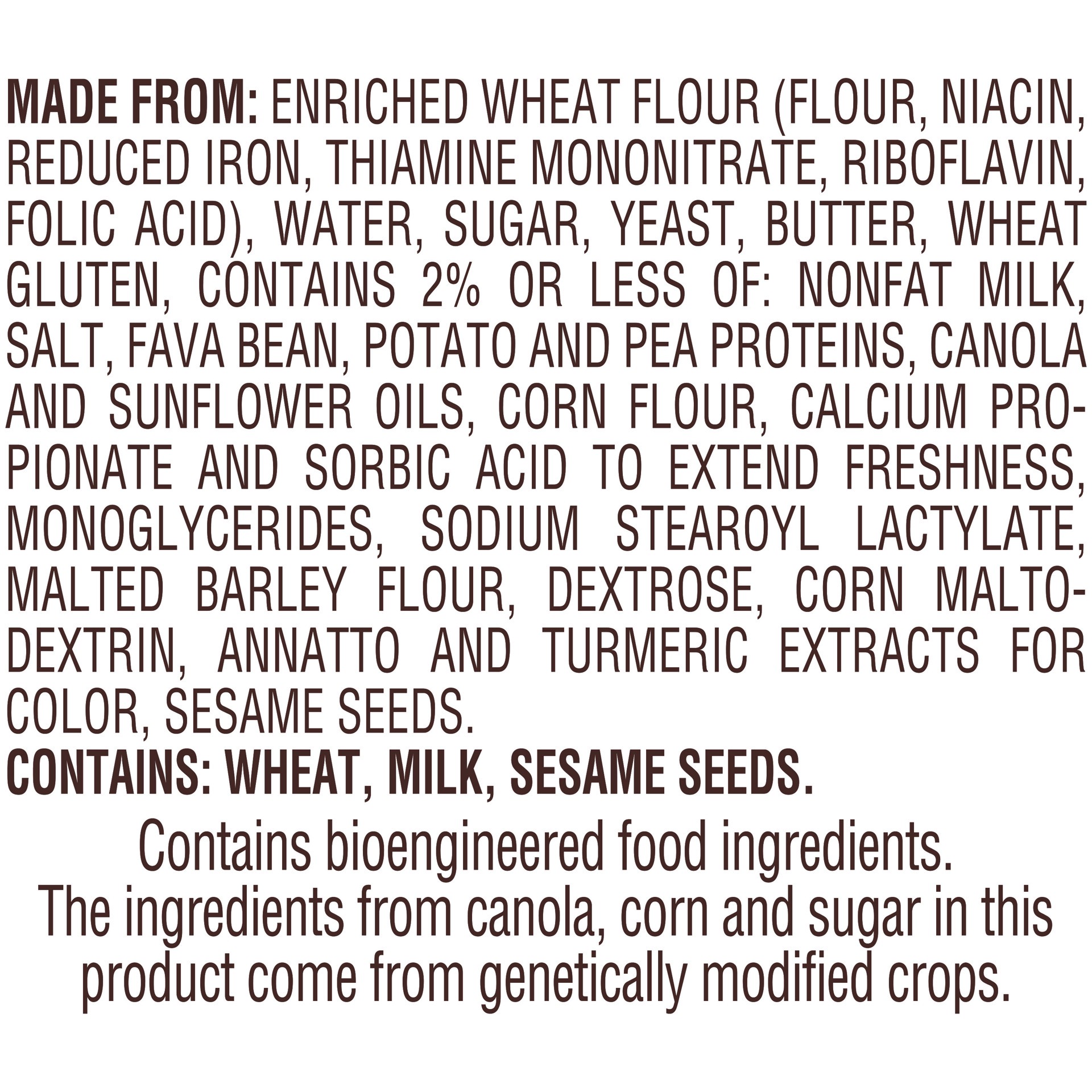 MADE FROM: ENRICHED WHEAT FLOUR (FLOUR, NIACIN, REDUCED IRON, THIAMINE MONONITRATE, RIBOFLAVIN, FOLIC ACID), WATER, SUGAR, YEAST, BUTTER, WHEAT GLUTEN, CONTAINS 2% OR LESS OF: NONFAT MILK, SALT, FAVA …