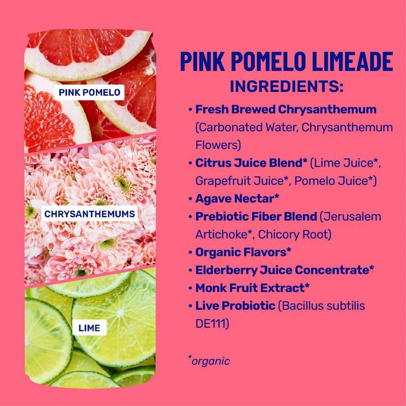 Fresh Brewed Chrysanthemum (Carbonated Water, Chrysanthemum Flowers), Citrus Juice Blend* (Grapefruit Juice*, Pomelo Juice*), Lime Juice*, Agave Nectar*, Prebiotic Fiber Blend (Jerusalem Artichoke*, C…