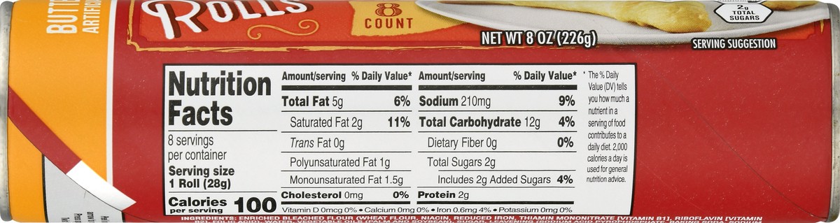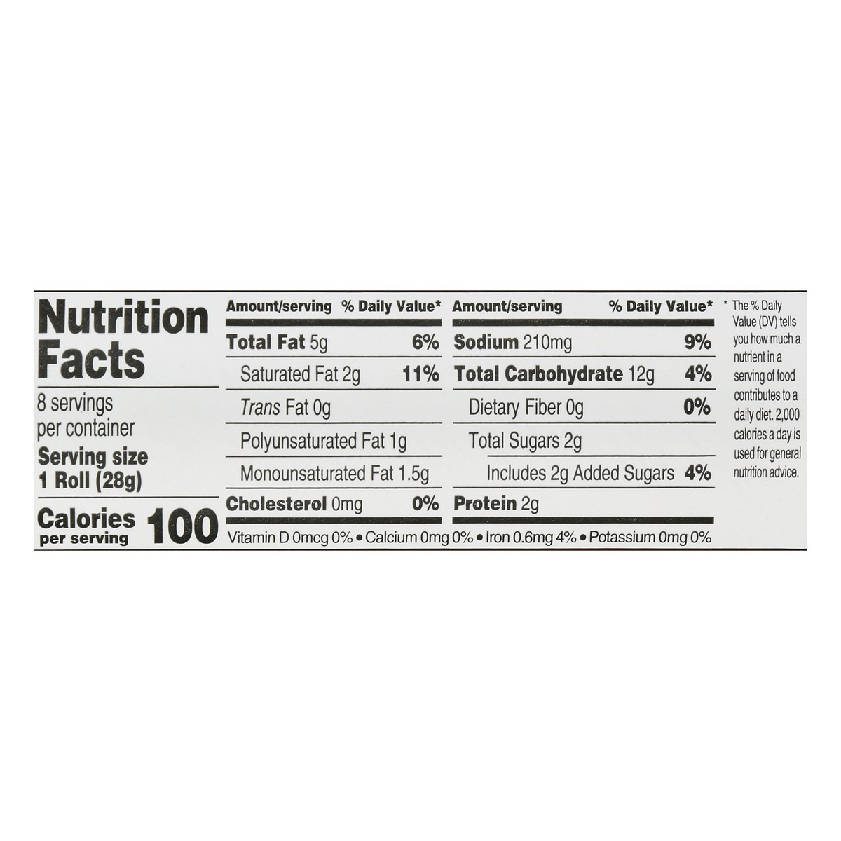 Artificially flavored. Per 1 Roll: 100 calories; 2 g sat fat (11% DV); 210 mg sodium (9% DV); 2 g total sugars. Contains a bioengineered food ingredients. No high fructose corn syrup. No certified syn…