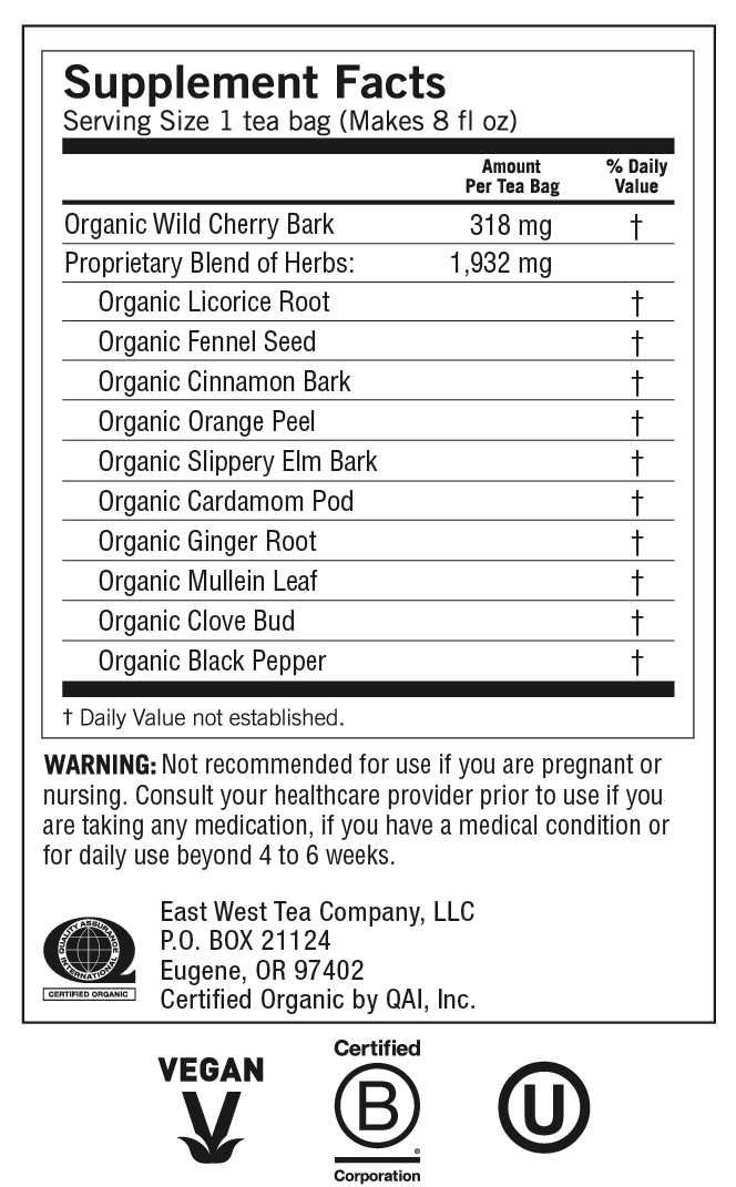 Organic Licorice Root, Organic Fennel Seed, Organic Wild Cherry Bark, Organic Cinnamon Bark, Organic Orange Peel, Organic Slippery Elm Bark, Organic Cardamom Pod, Organic Ginger Root, Organic Mullein …