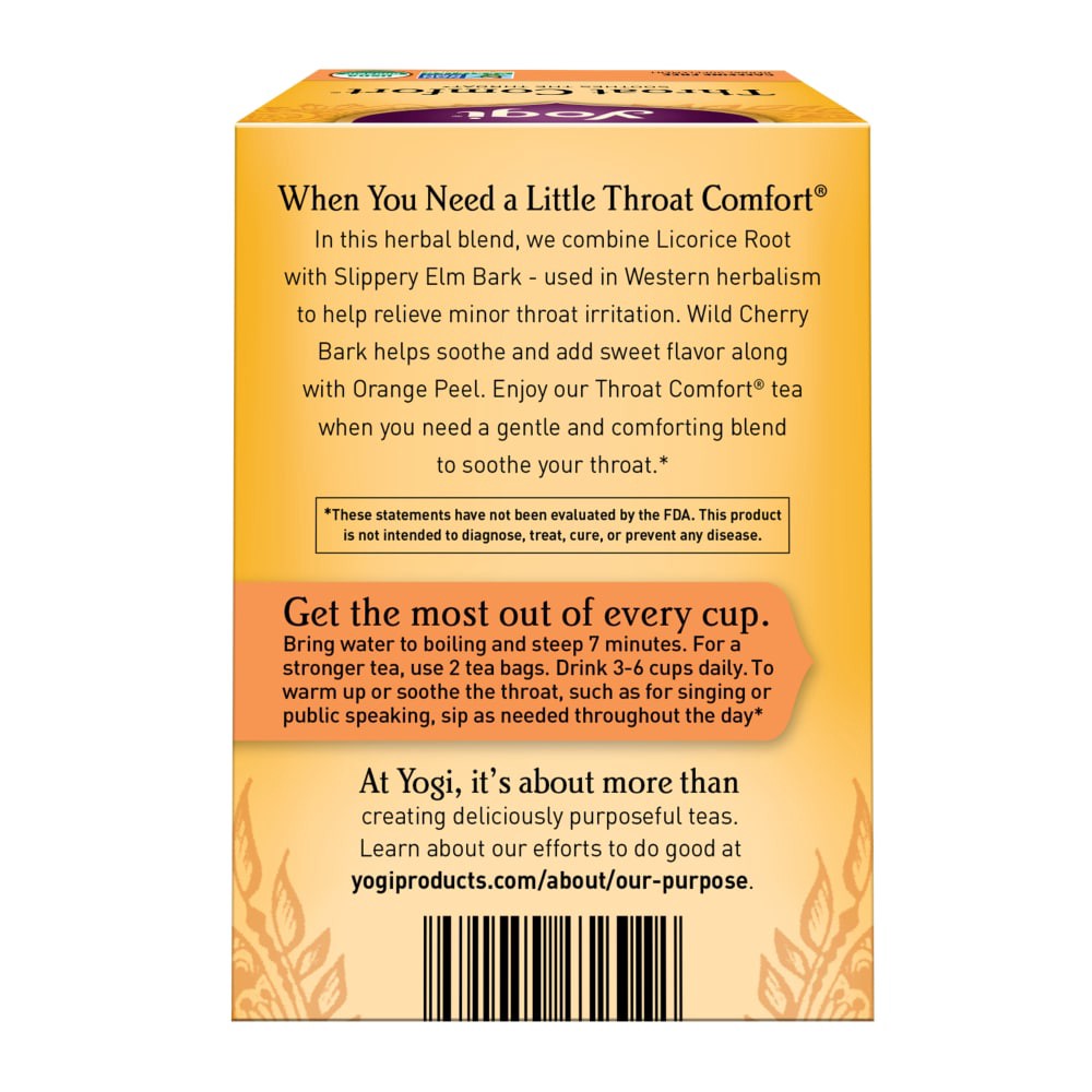 - FLAVOR: Yogi Throat Comfort tea combines Wild Cherry Bark with Orange Peel and Licorice Root for a soothing and sweet herbal tea blend
