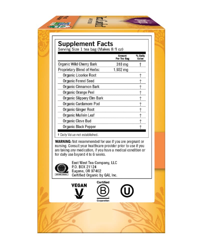 Organic Licorice Root, Organic Fennel Seed, Organic Wild Cherry Bark, Organic Cinnamon Bark, Organic Orange Peel, Organic Slippery Elm Bark, Organic Cardamom Pod, Organic Ginger Root, Organic Mullein …