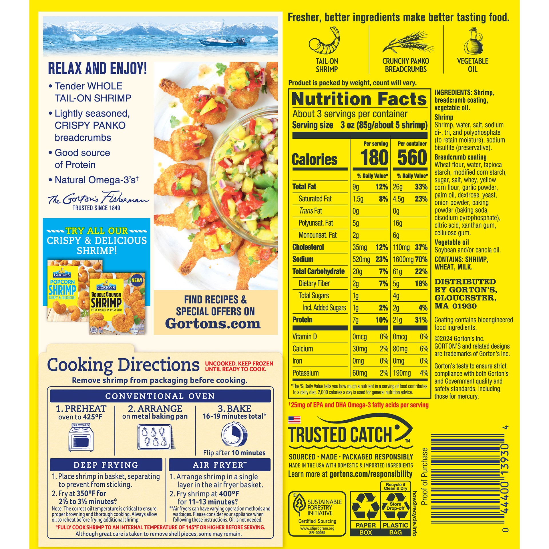 SHRIMP, BREADCRUMB COATING, VEGETABLE OIL. SHRIMP: SHRIMP, DI-, TRI-, AND POLYPHOSPHATE (TO RETAIN MOISTURE), SODIUM BISULFITE (PRESERVATIVE). BREADCRUMB COATING: WHEAT FLOUR, WATER, TAPIOCA STARCH, M…