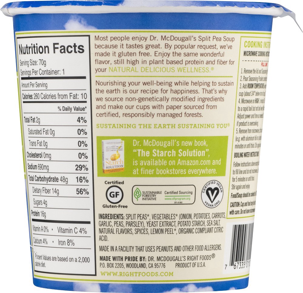 15 g protein per 70 g serving. Certified gluten-free. Certified vegan. vegan.org. Non GMO Project verified. nongmoproject.org. Most people enjoy Dr. McDougall's Split Pea Soup because it tastes great.…