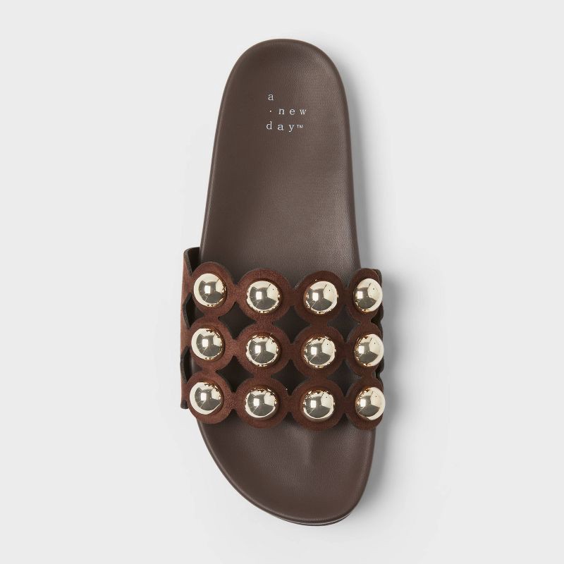 Step out in style with these Nash Sandals with Memory Foam Insole from A New Day™. These Nash sandals feature a single wide band with shiny beads for a glam look. The slip-on design allows easy on and…