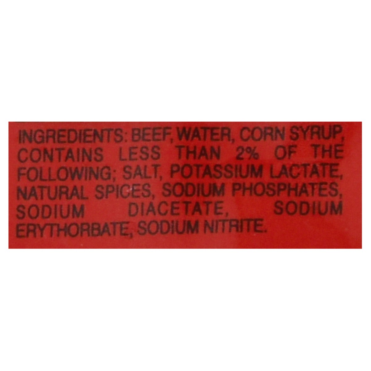 Beef, Water, Corn Syrup, Contains Less than 2% of the Following: Salt, Potassium Lactate, Natural Spices, Sodium Phosphates, Sodium Diacetate, Sodium Erythorbate, Sodium Nitrite.