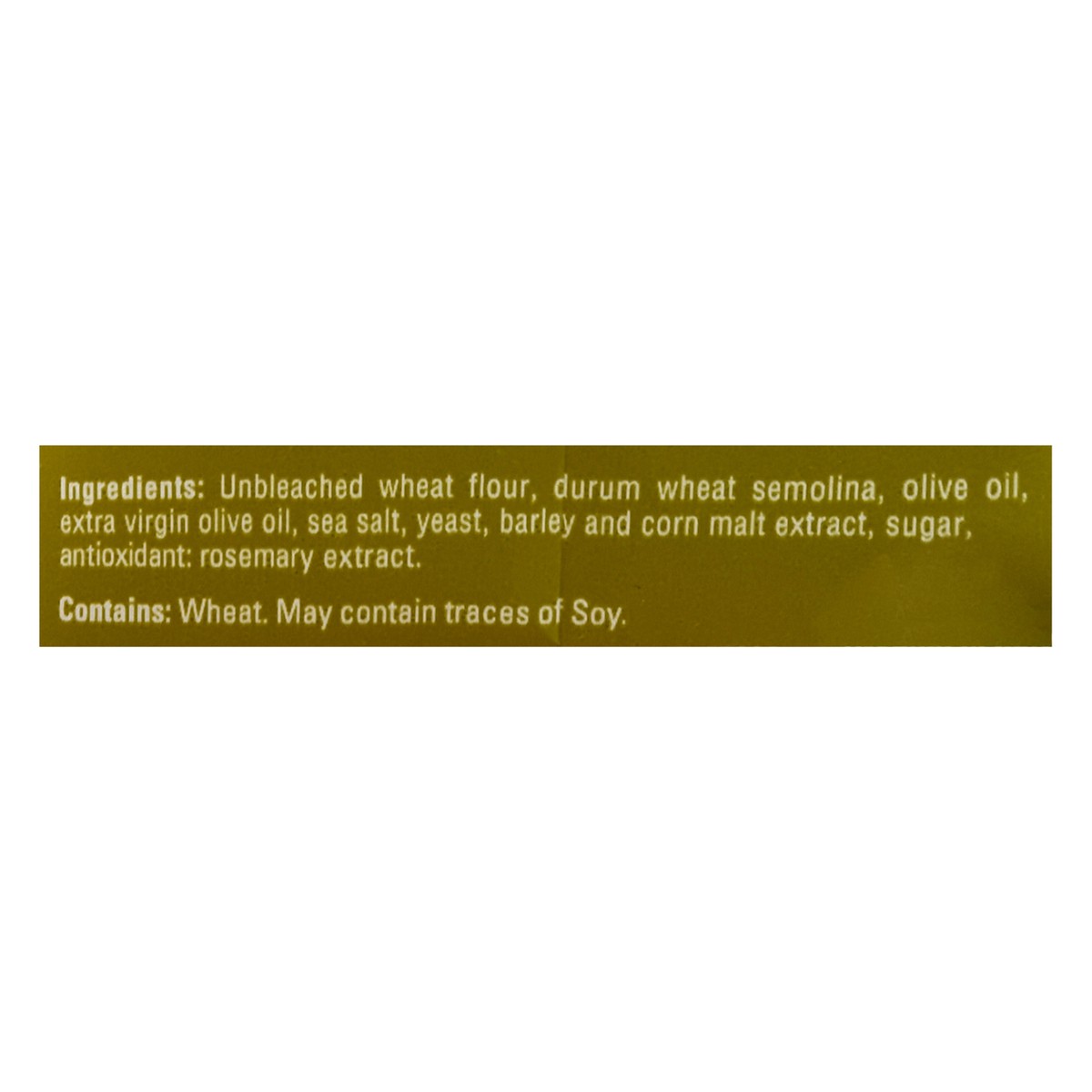 Unbleached Wheat Flour, Durum Wheat Semolina, Olive Oil, Extra Virgin Olive Oil, Sea Salt, Yeast, Barley and Corn Malt Extract, Sugar, Antioxidant: Rosemary Extract.