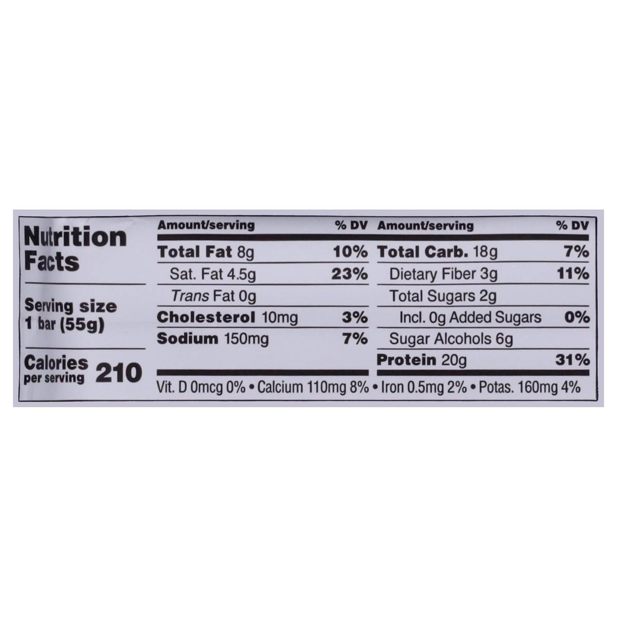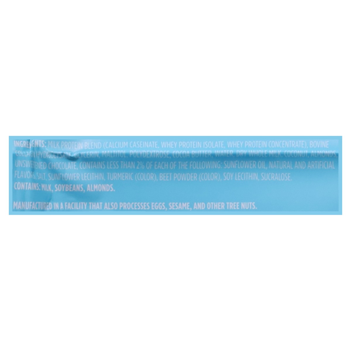 Milk Protein Blend (Calcium Caseinate, Whey Protein Isolate, Whey Protein Concentrate), Bovine Collagen Hydrolysate, Glycerin, Maltitol, Polydextrose, Cocoa Butter, Water, Dry Whole Milk, Coconut, Alm…