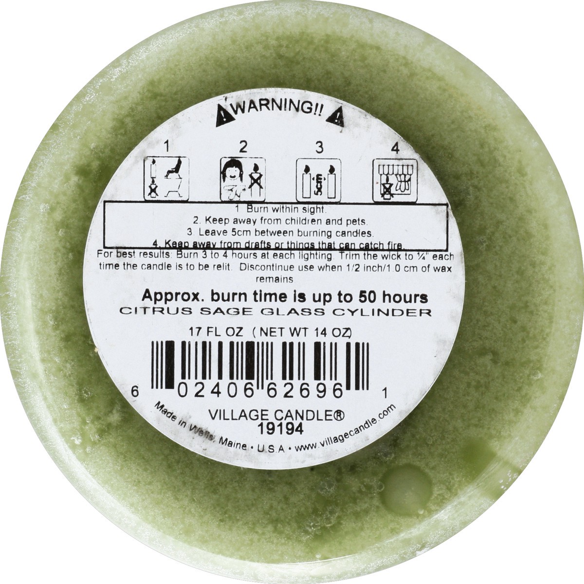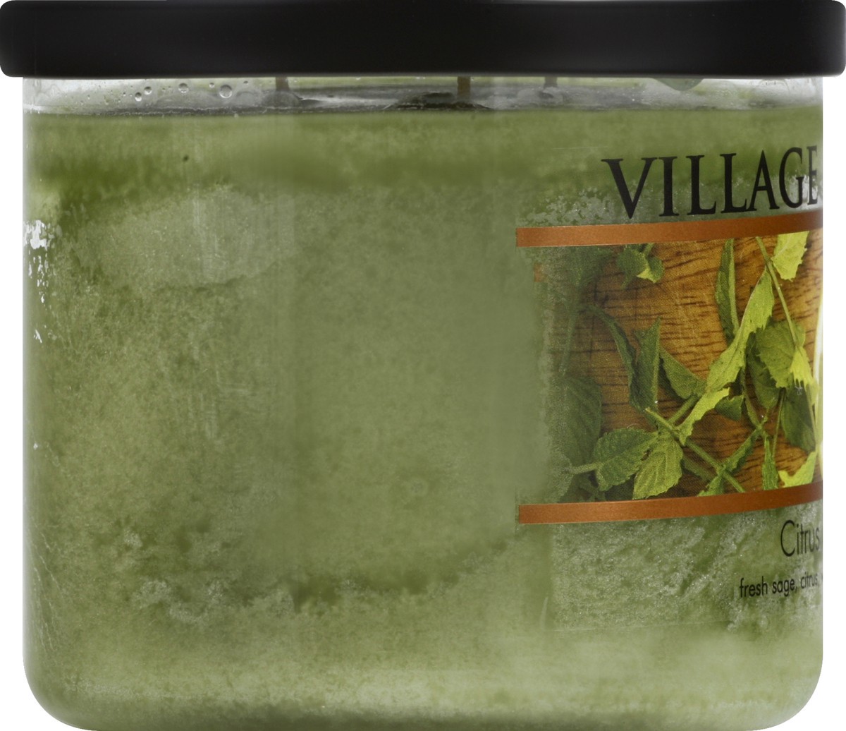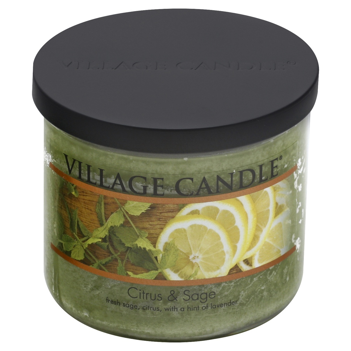 Fresh sage, citrus, with a hint of lavender. Citrus sage glass cylinder. Approx. burn time is up to 5 hours. www.villagecandle.com. Made in Wells, Maine USA.