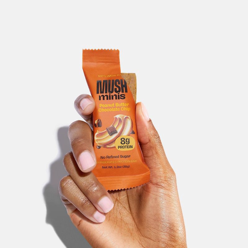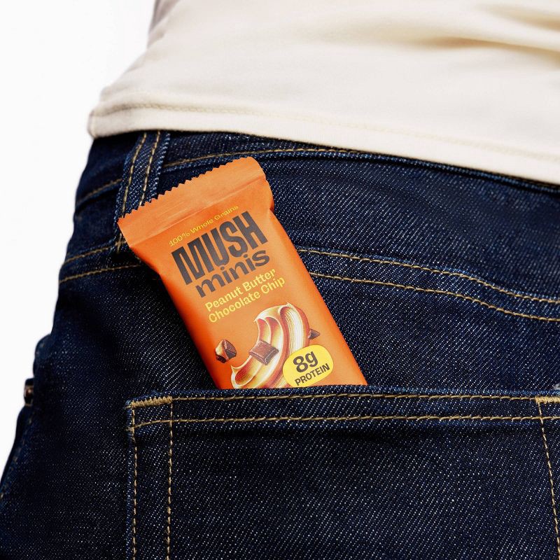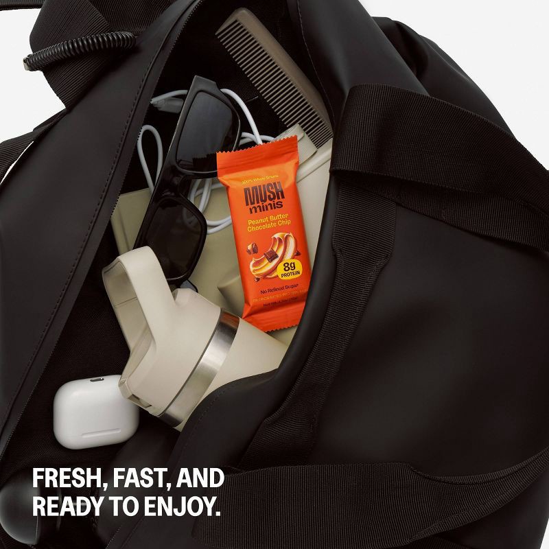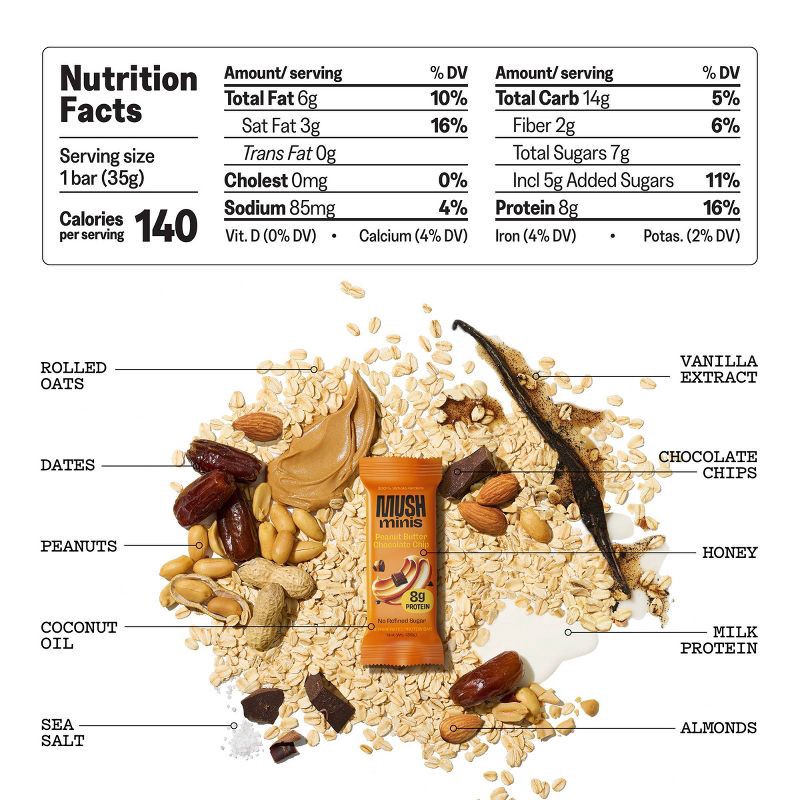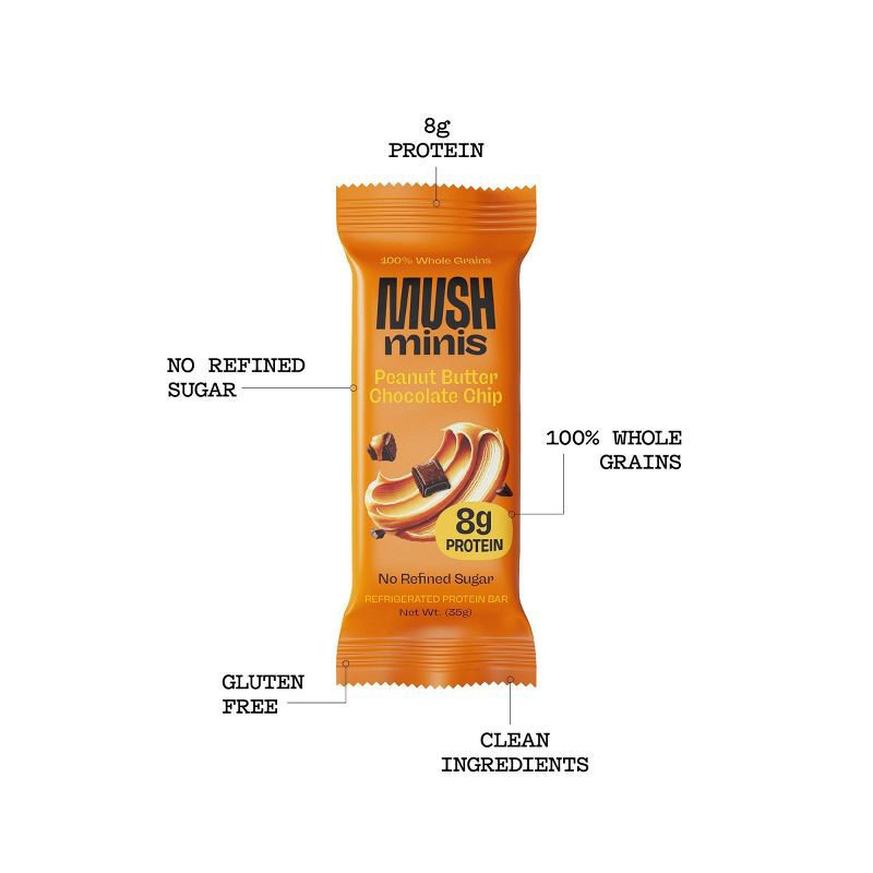 - MUSH Peanut Butter Chocolate Chip Protein Bar Minis are made with clean ingredients for great energy. Your favorite overnight oats, now transformed into a fresh, refrigerated bar.