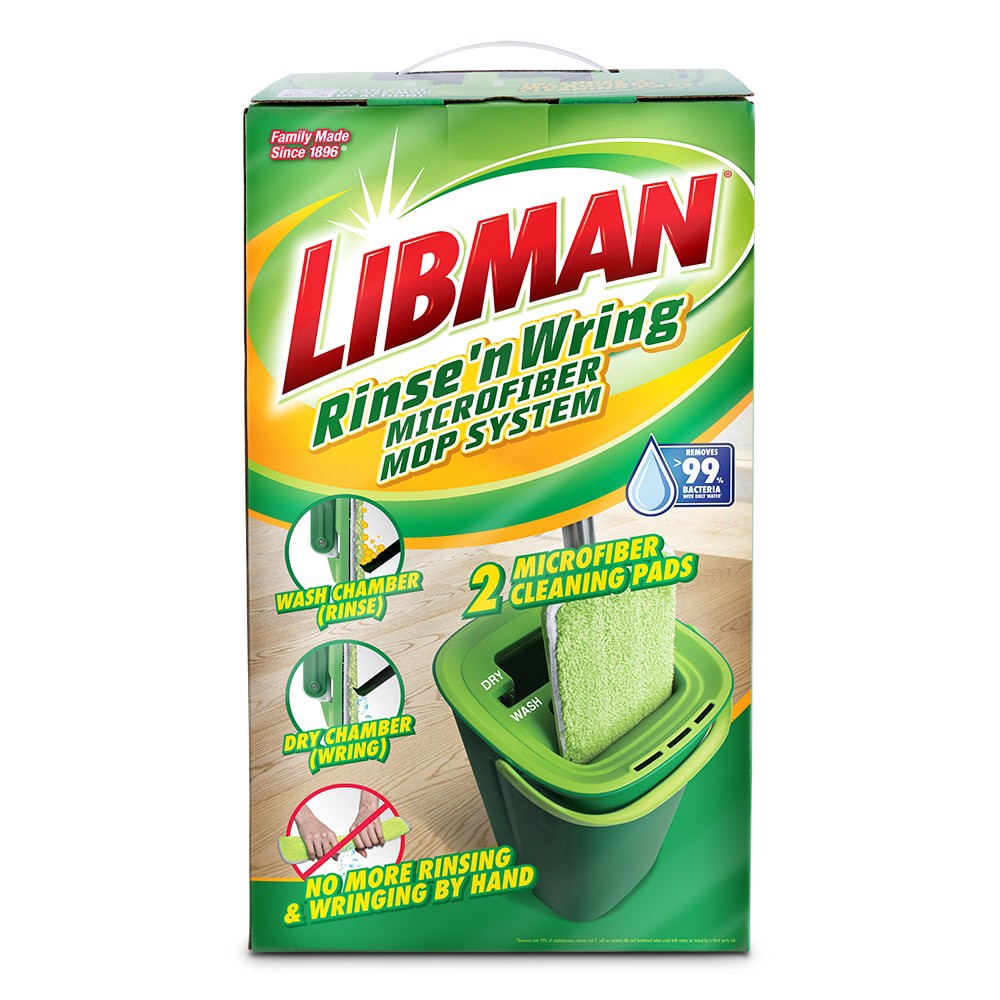 All-in-one mop kit includes mop and bucket. Includes 2 machine washable microfiber mop heads. Push the handle down once for a damp mop or more times for a drier mop. User-friendly wringing mechanism f…