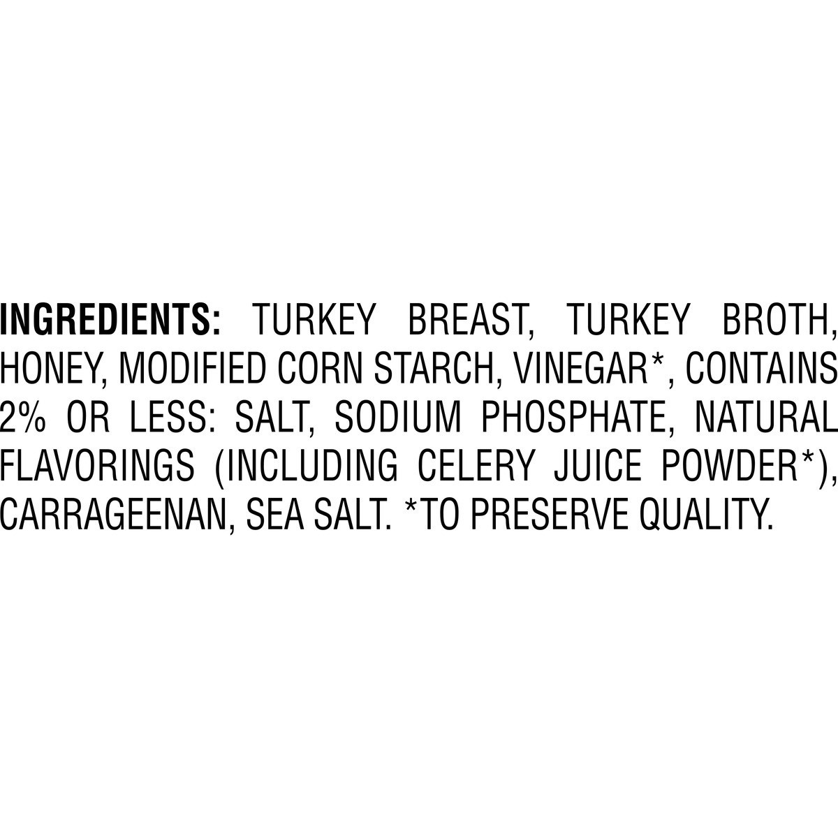 Turkey Breast, Turkey Broth, Honey, Modified Corn Starch, Vinegar*, Contains 2% Or Less: Salt, Sodium Phosphate, Natural Flavorings (Including Celery Juice Powder*), Carrageenan, Sea Salt. *to preserv…