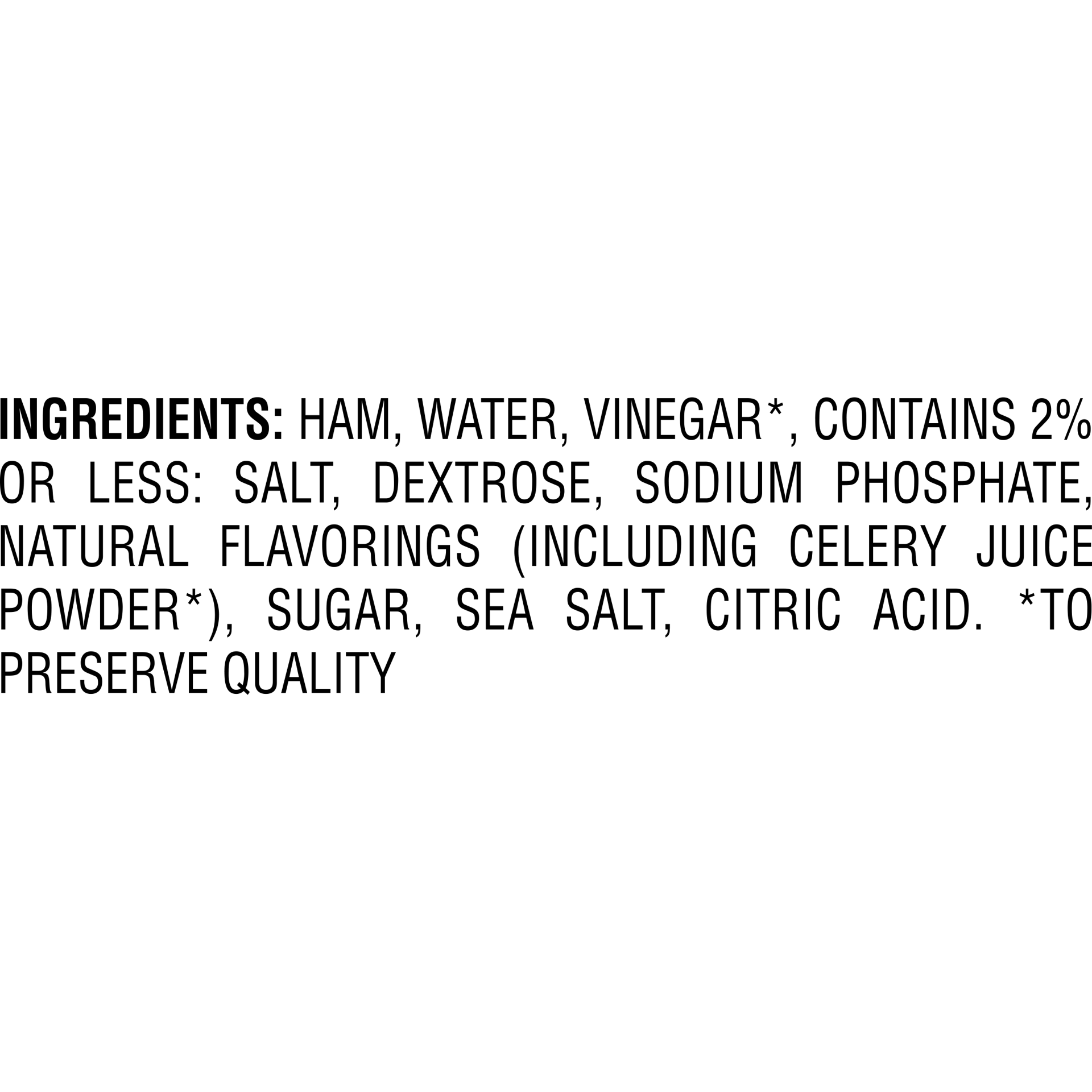 Ham, Water, Vinegar*, Contains 2% Or Less: Salt, Dextrose, Sodium Phosphate, Natural Flavorings (Including Celery Juice Powder*), Sugar, Sea Salt, Citric Acid. *To Preserve Quality.