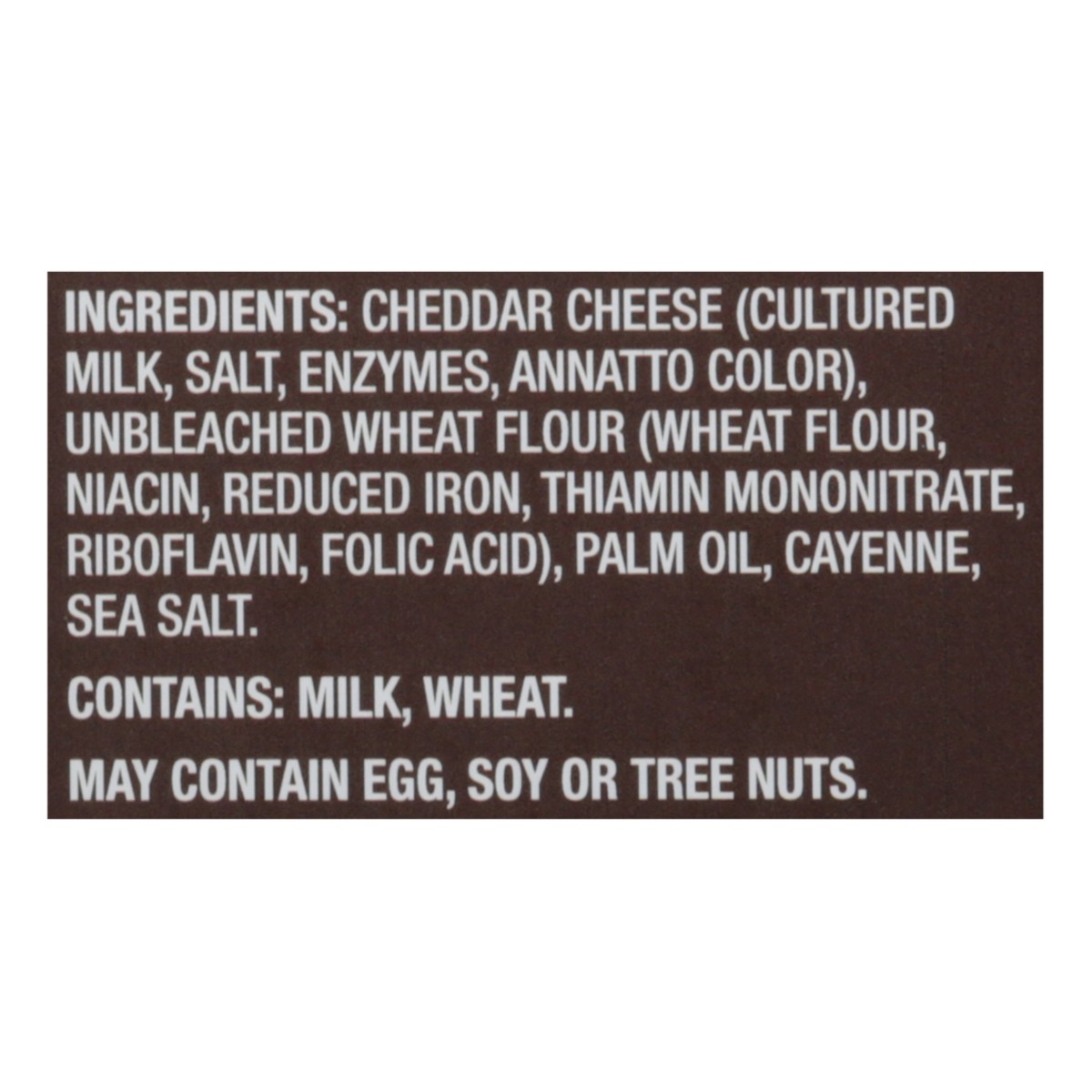 Cheddar Cheese (Cultured Milk, Salt, Enzymes, Annatto Color), Unbleached Wheat Flour (Wheat Flour, Niacin, Reduced Iron, Thiamin Mononitrate, Riboflavin, Folic Acid), Palm Oil, Cayenne, Sea Salt.