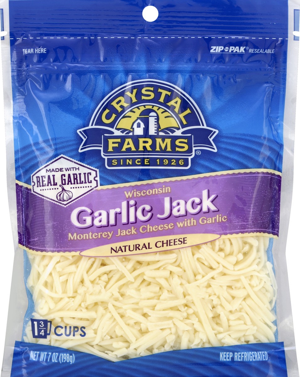 Monterey jack cheese with garlic. Natural cheese. 1-3/4 cups. Zip-Pak: Resealable. Since 1926. Thank you for choosing Crystal Farms. Providing you and your family with great tasting cheese at a great …